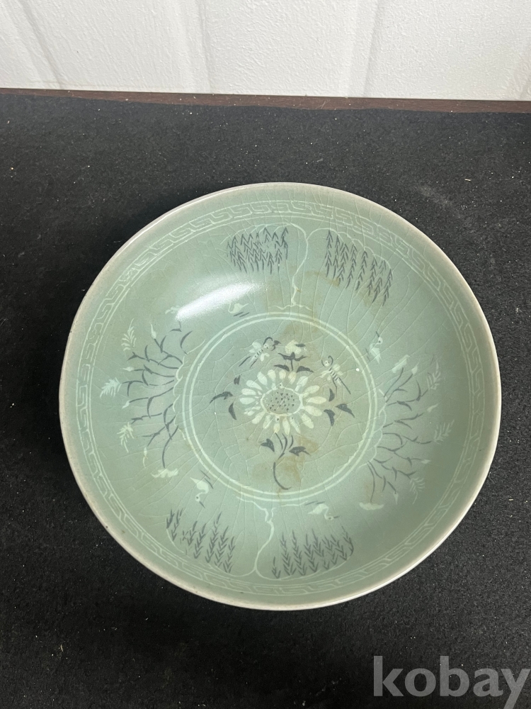 맑은 비취색 유약 위에 흑백 상감 기법으로 국화와 양류학문을 섬세하게 표현하였습니다.