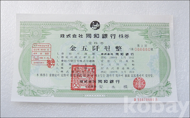 동화은행 5,000원권 실물 종이 주식 (801)