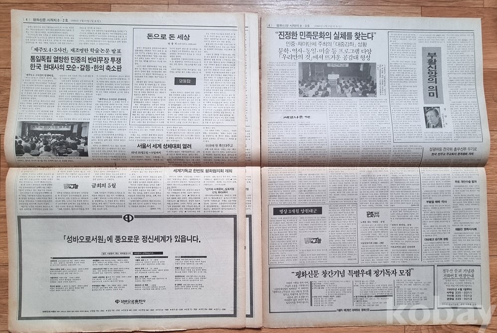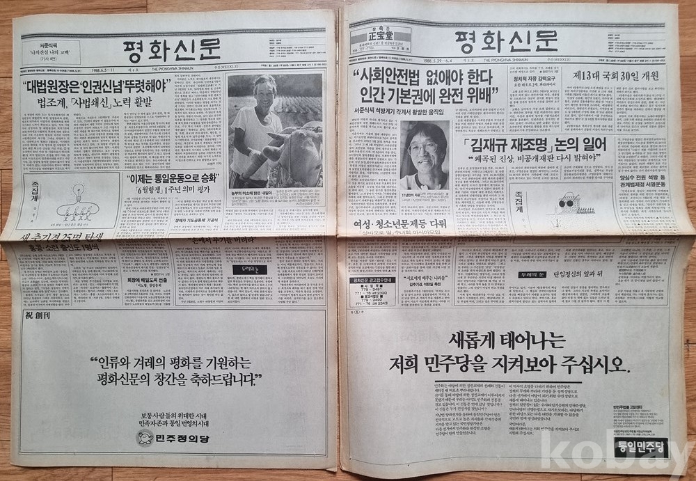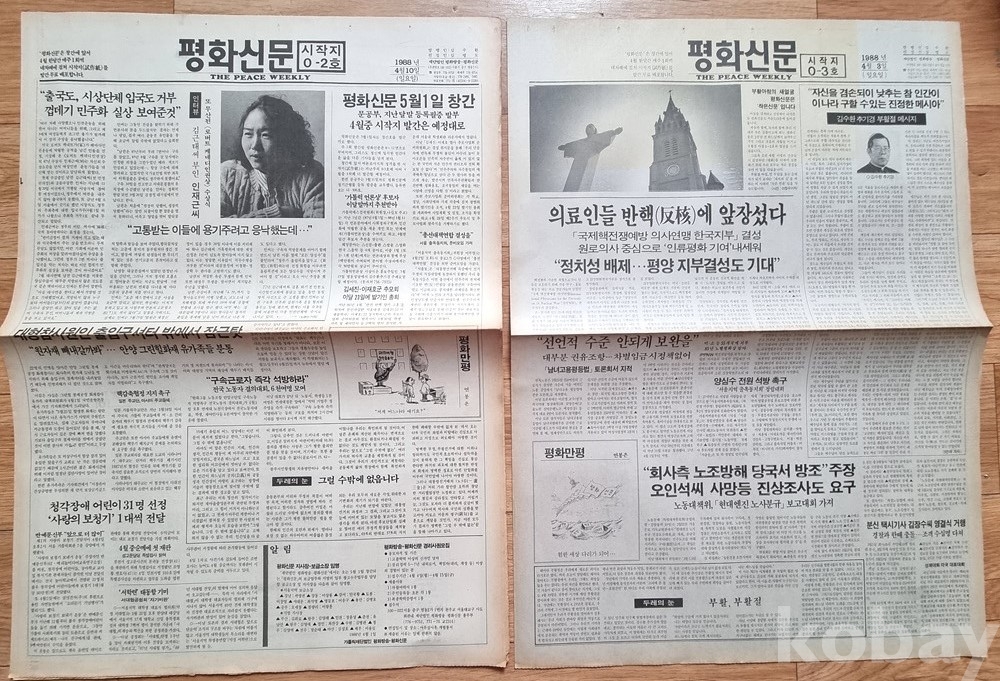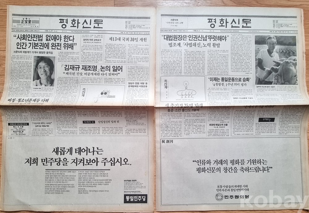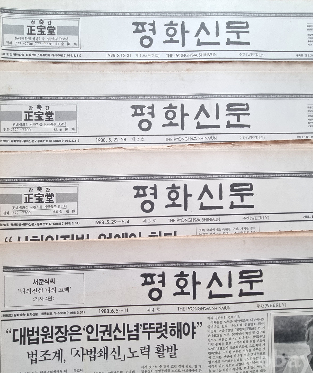 역사적 가치: 1988년 5월 15일 창간된 '평화신문'의 역사적인 **창간호(제1호)**를 포함하고 있습니다.