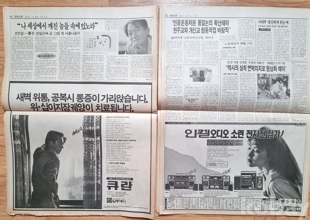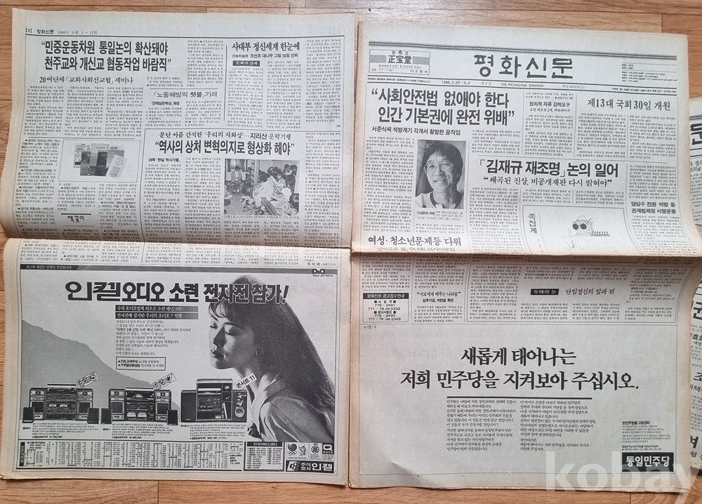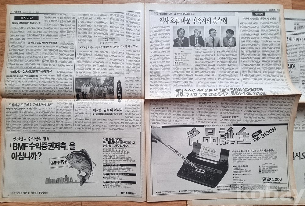 당시 시대상을 보여주는 '민주정의당', '통일민주당'의 광고와 인켈 오디오, 샤프 전자타자기 등