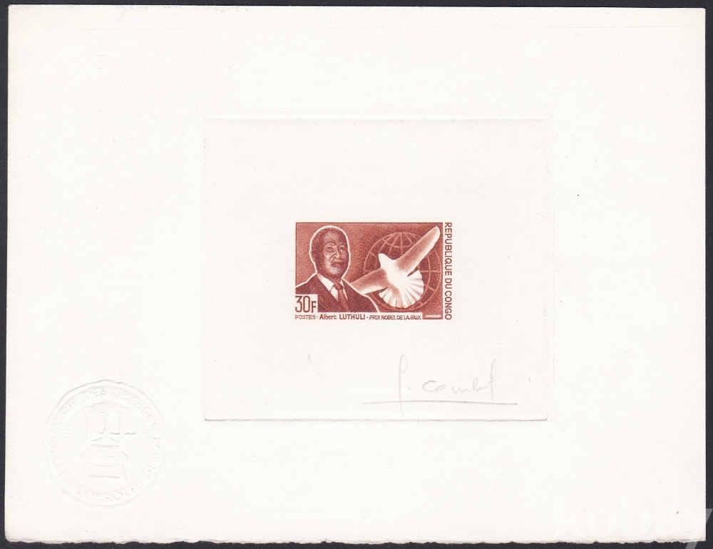 (하늘천) 콩고 Sc170 1960년 노벨 평화상, 앨버트 루툴리 (1899-1967), 브라운 컬러 사인 다이 프루프