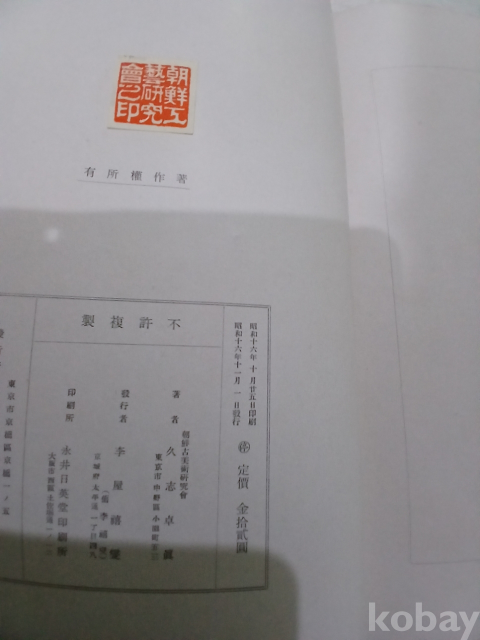 1941년(소화 16년) **조선고미술연구회(朝鮮古美術硏究會)**에서 발행한 구지 타쿠미(久志卓眞) 저, 『도설 조선미술사(說圖 朝鮮美術史)』 초판본