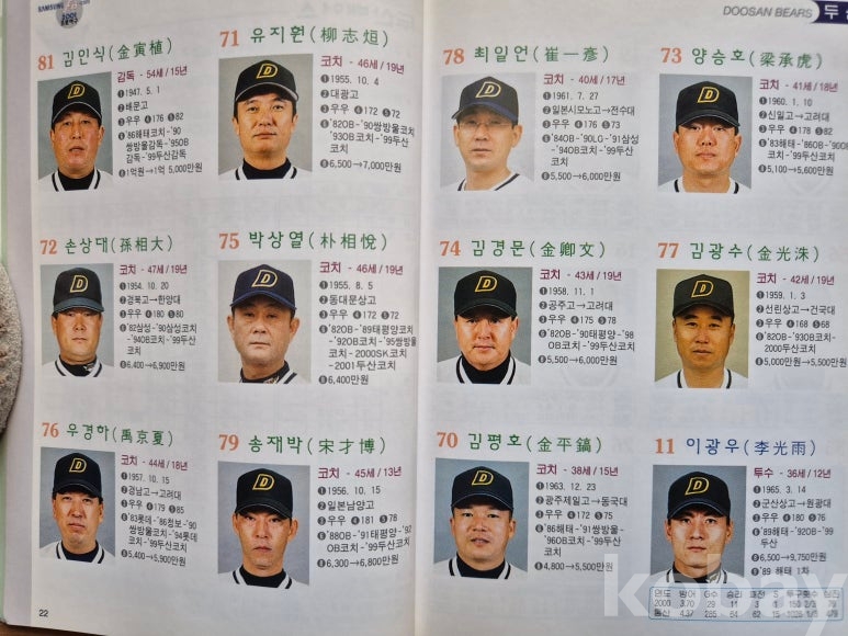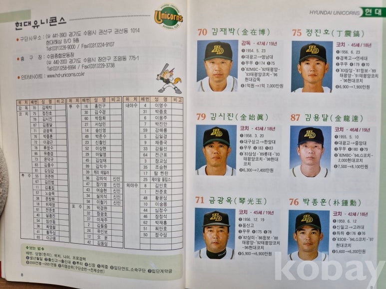 한국야구위원회 발행 야구 수집가라면 이 한권의 책으로 모든 선수 소속 8구단과 신상 기록을 알수 있어 야구자료 수집에 많은 도움이 될것입니다.