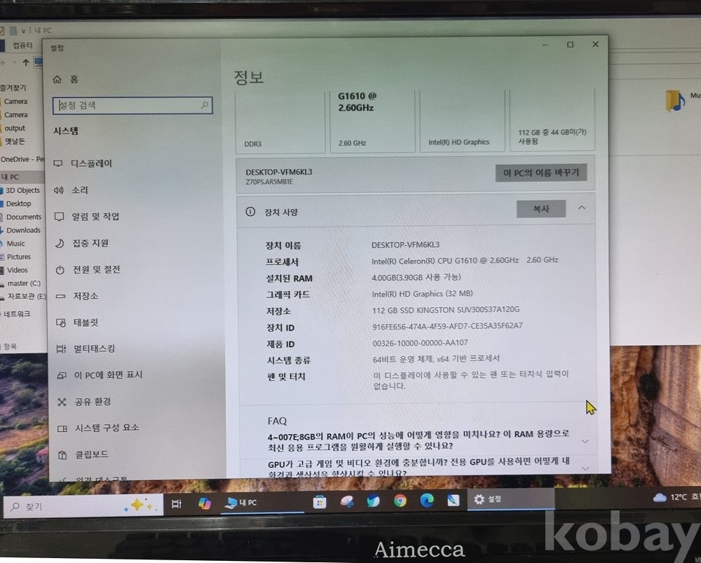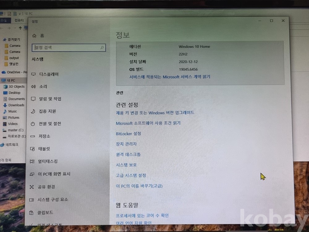 운영체제: Windows 10 Home (64비트) 설치 완료