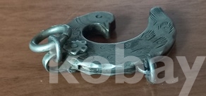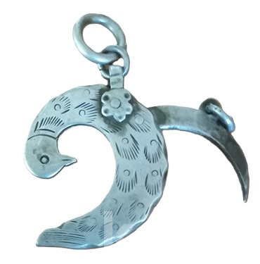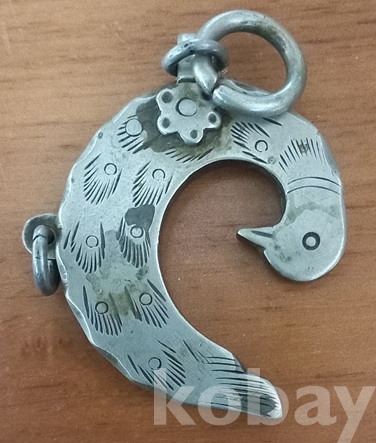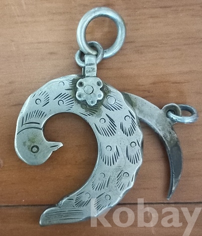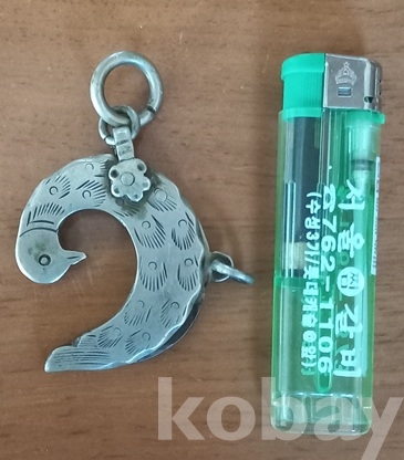 特徵, 새가 앉아서 부리를 뒤로 돌린 형태로 거의 원을 이루고.. 부리와 눈의 조각이 뚜렷하고 깃털이 음각되어 있읍니다. 배 부위에 양쪽면 화형조각에 뒤집어진 U자형을 부쳤고 거기에 크고작은 두 개의 원형고리를 끼웠다. 한편 침은 초승달형이고 가운데 쯤 등에 작은 돌출을 만들고 작은 고리를 달았읍니다. 이 침은 밀어서 안쪽에 넣어 숨겨 넣고 사용할때 뺄수가 있도록 되어 있고. 봉황담배침이라 한건 원판매자가 그렇게해서 따른거고.. 전 일찍이 이런건 본적이 없으니 전혀 아는바가 없읍니다.