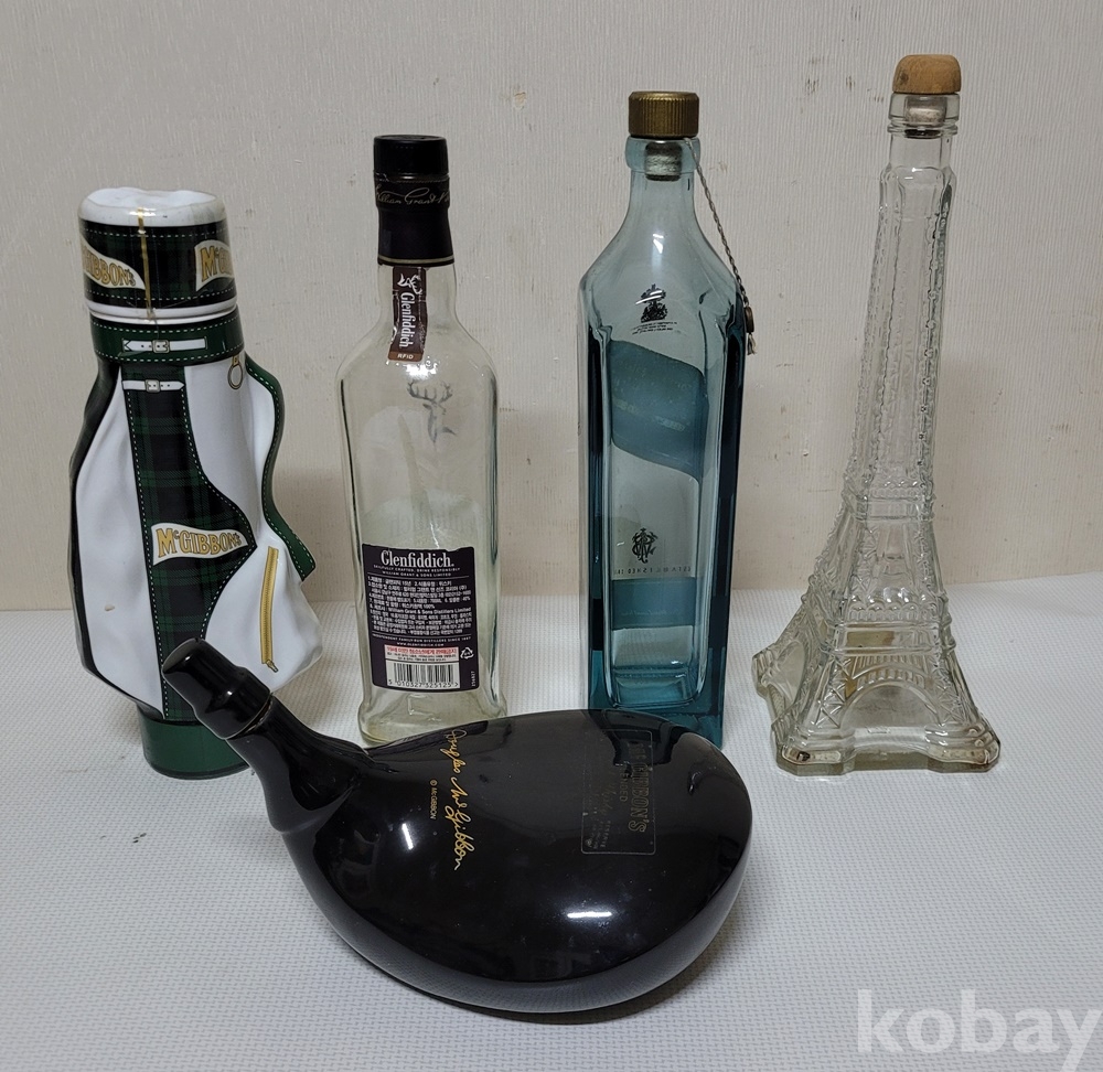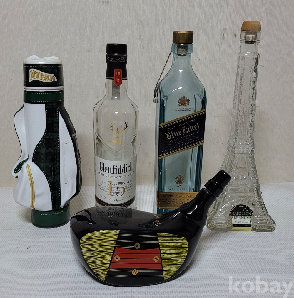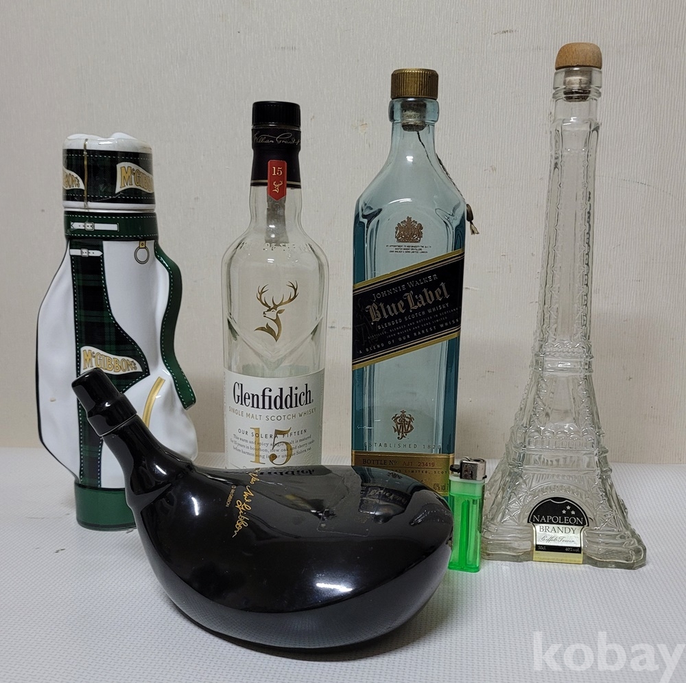 프랑스 산 에펠탑 형 NAPOLEON 브랜디. SCOTLAND산 위스키들로 4각병 죠니워커 BLUE LABEL. 3각병 위스키 Glenfiddich. 골프 가방형 의스키 McGIBBON’S. 우드형 위스키 McGIBBON’S. 5개의 공병들로 상태 모두 양호합니다.