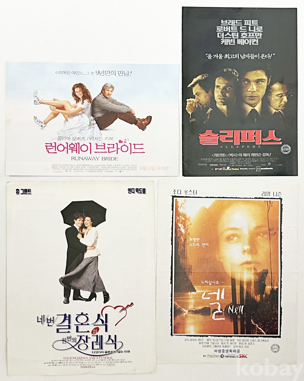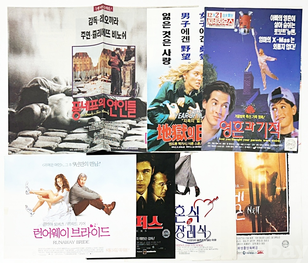 상품설명 | 1) 퐁네프의 연인들 / 37.5 x 26.3 cm / 표지 접힌자국 있음 2) 지옥의 일요일 / 19 x 26 cm 3) 영혼과 기적 / 19 x 25.5 cm 4) 런어웨이 브라이드 / 25.5 x 18.3 cm 5) 슬리퍼스 / 17.5 x 27.5 cm 6) 네번 결혼식과 한번의 장례식 / 22 x 31 cm 7) 넬 / 21.3 x 29.5 cm / 표지 접힌자국 있음 7점 일괄. |