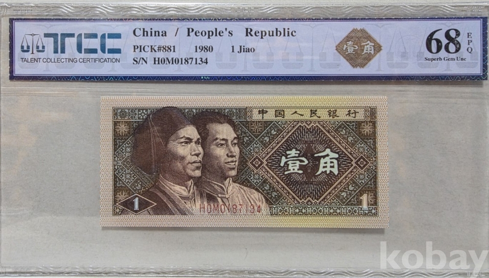 -1980년 중국 인민은행 발행 1각 지폐 TCC68 고등급 입니다.