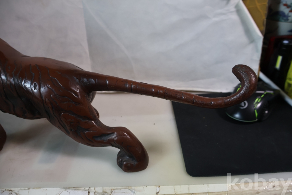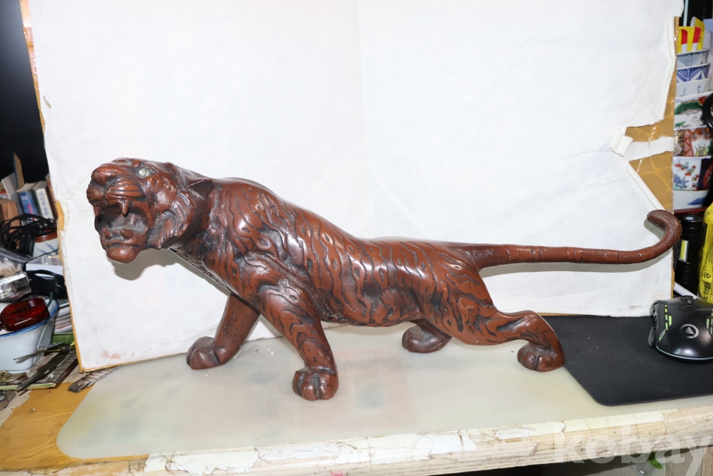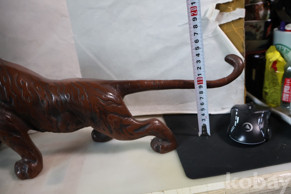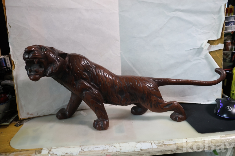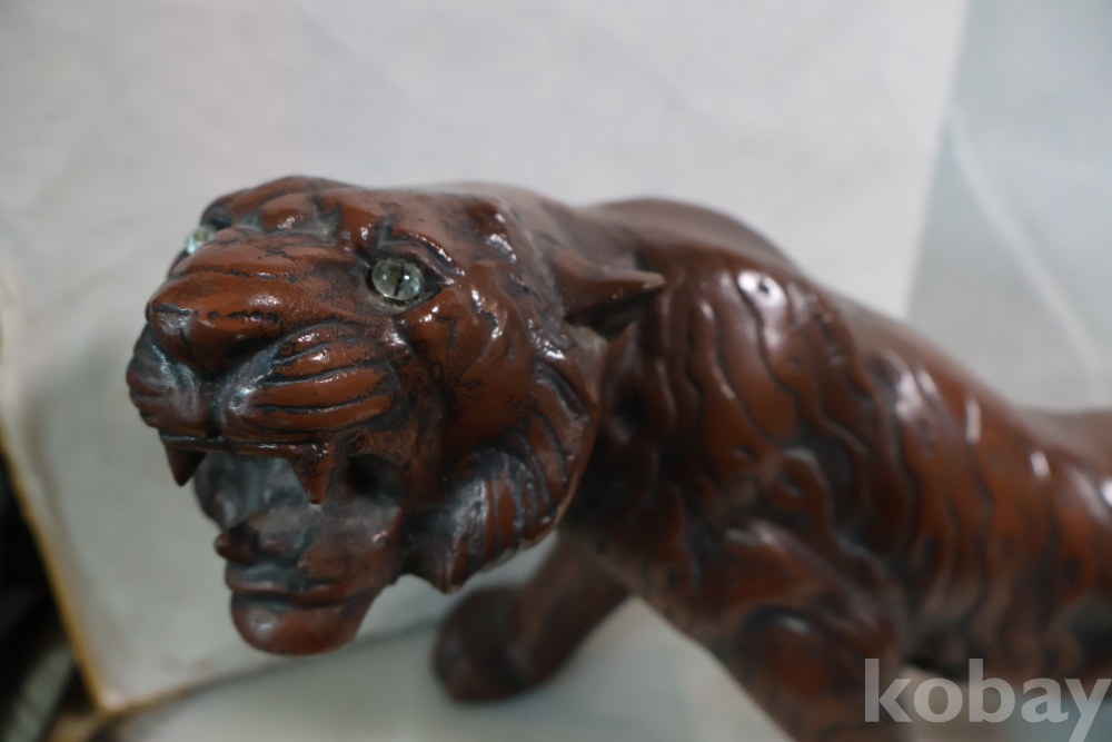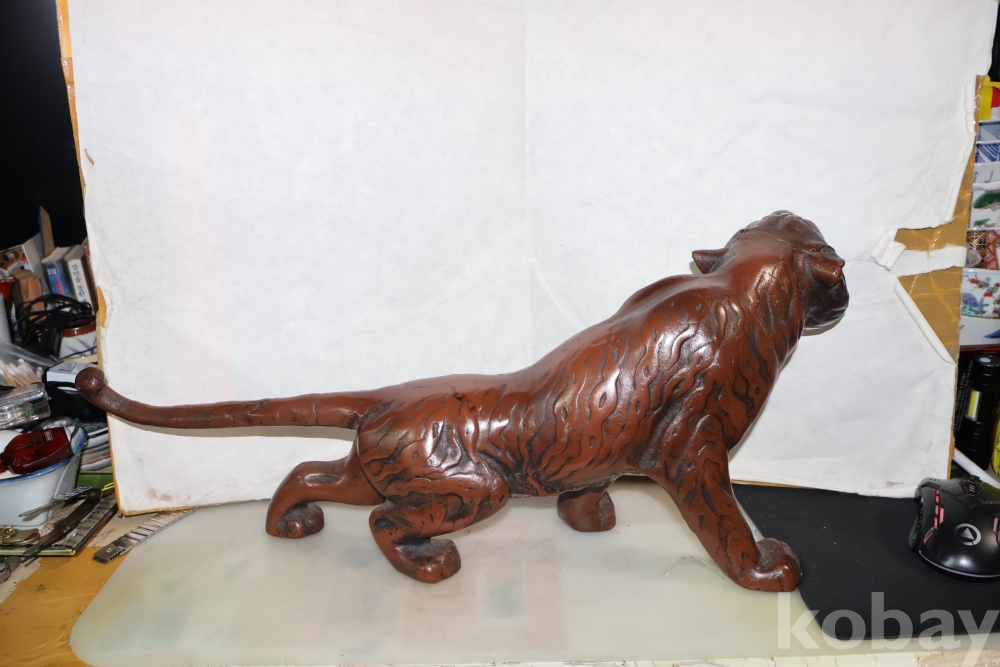 격이 다른 최고 명 임니다 격이 다른 명물 눈빛이 살아 있는 대형 호랑이 조각 상 임니다 표피의 색감 눈알 처리 등등 당대의 명품 이며 구리 철 합금 임니다 가죽의 문양 처리기법이 대단 함니다 두손으로 들어도 힘드는 무개감을 가진 명물