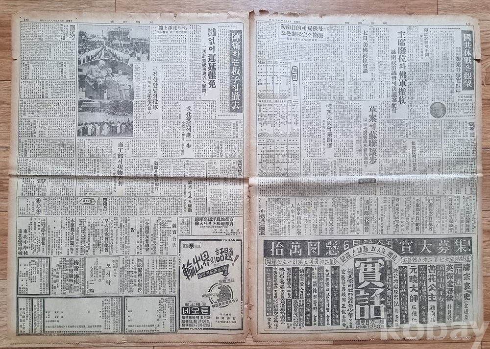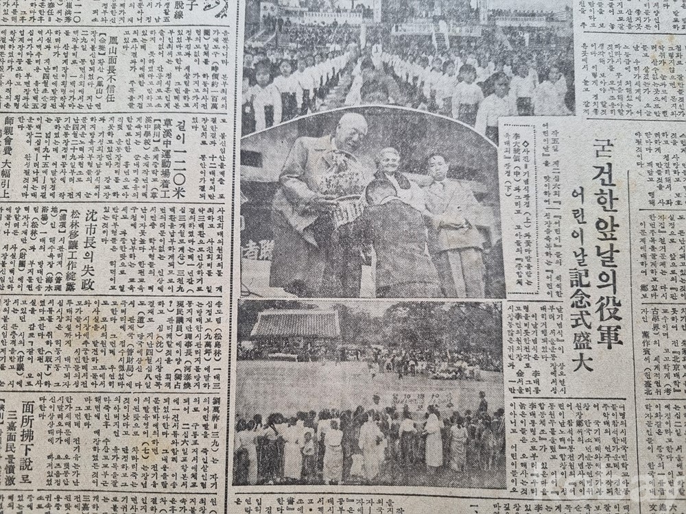 어린이날 기념 행사: 5월 6일자 신문인만큼, 전날 있었던 어린이날 행사 사진과 기사("진통하는 판자집 철거" 등)가 실려 있어 전후 서울의 풍경을 짐작게 합니다.