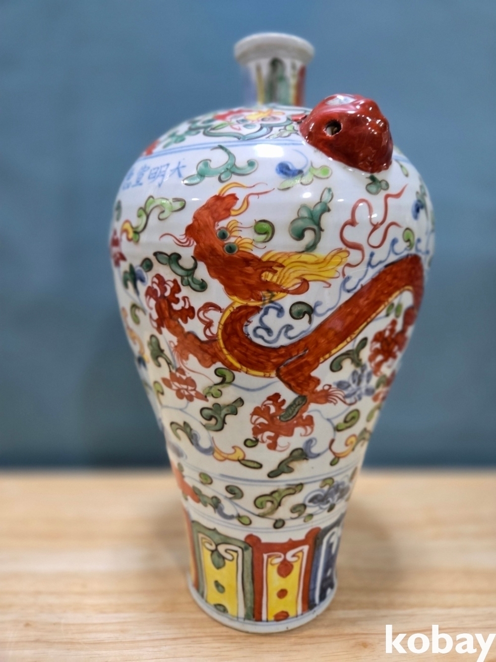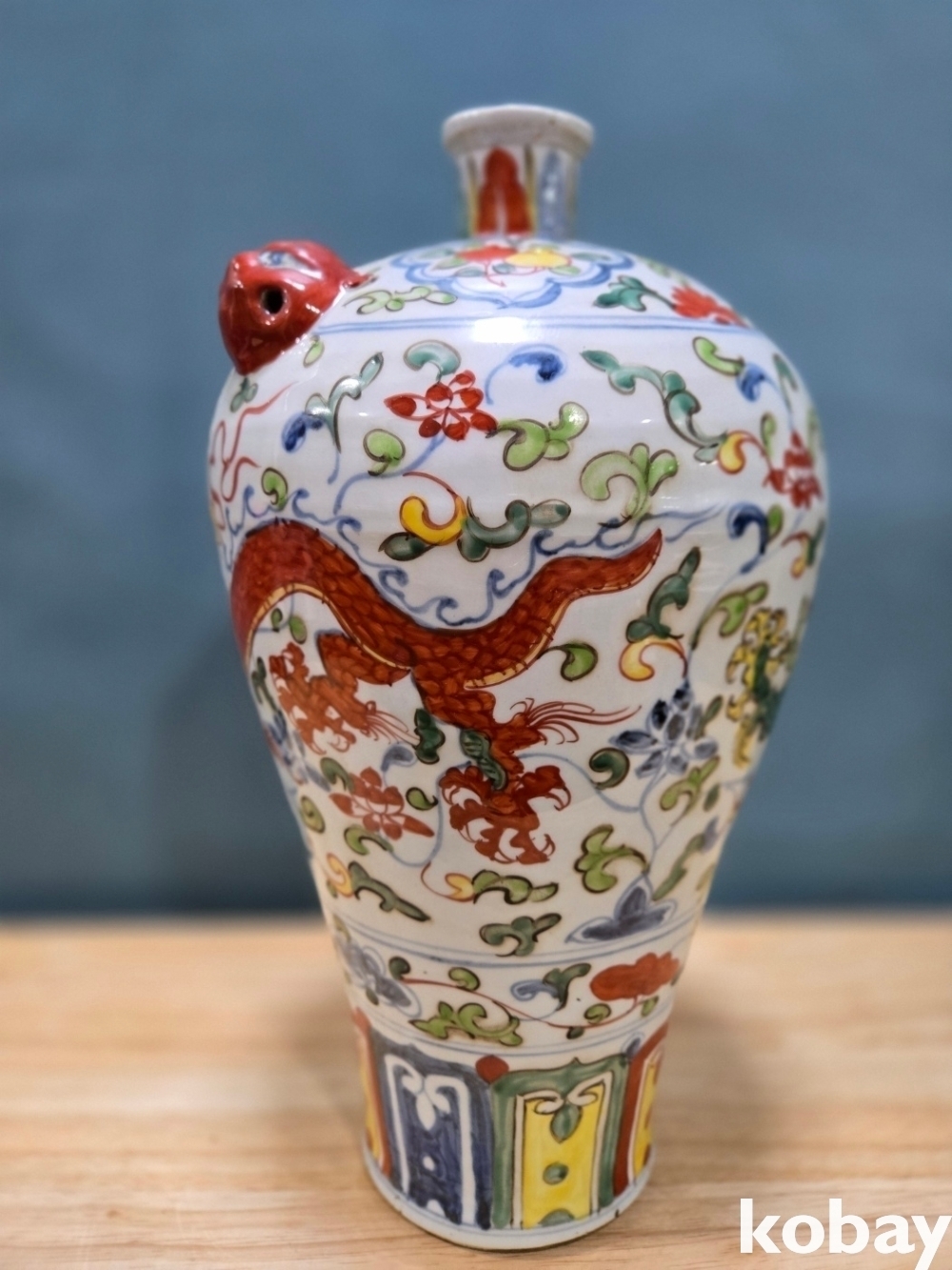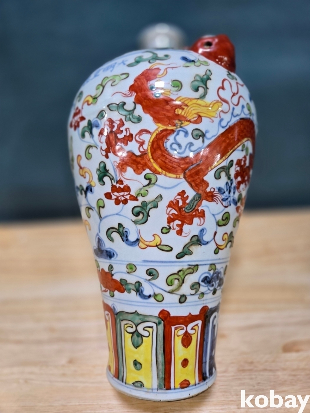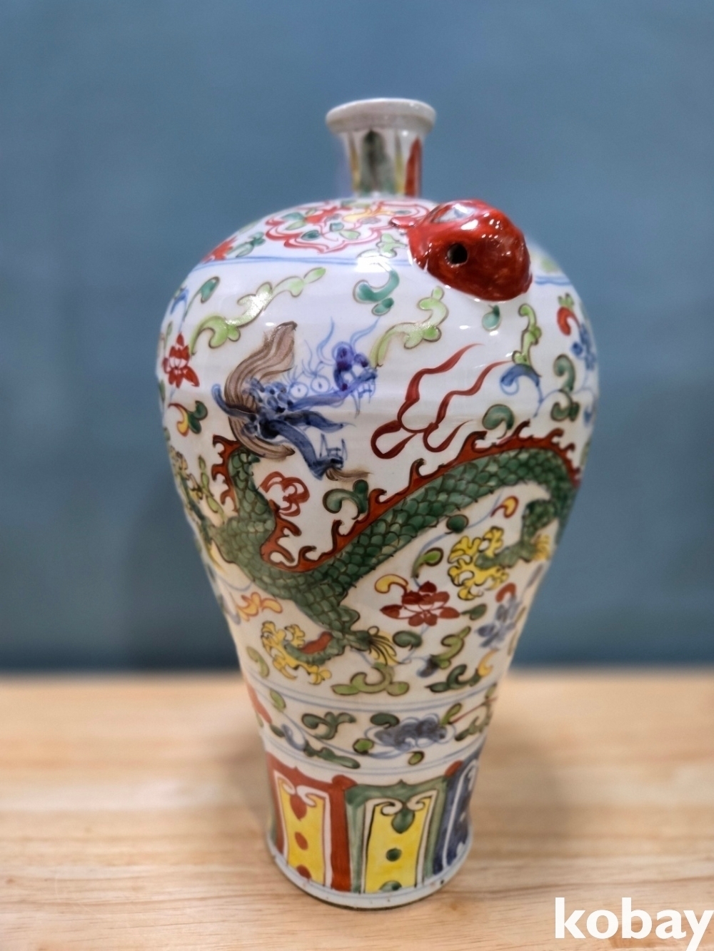 화려한 색상에 용 두마리 표현 매병 도자기 입니다.