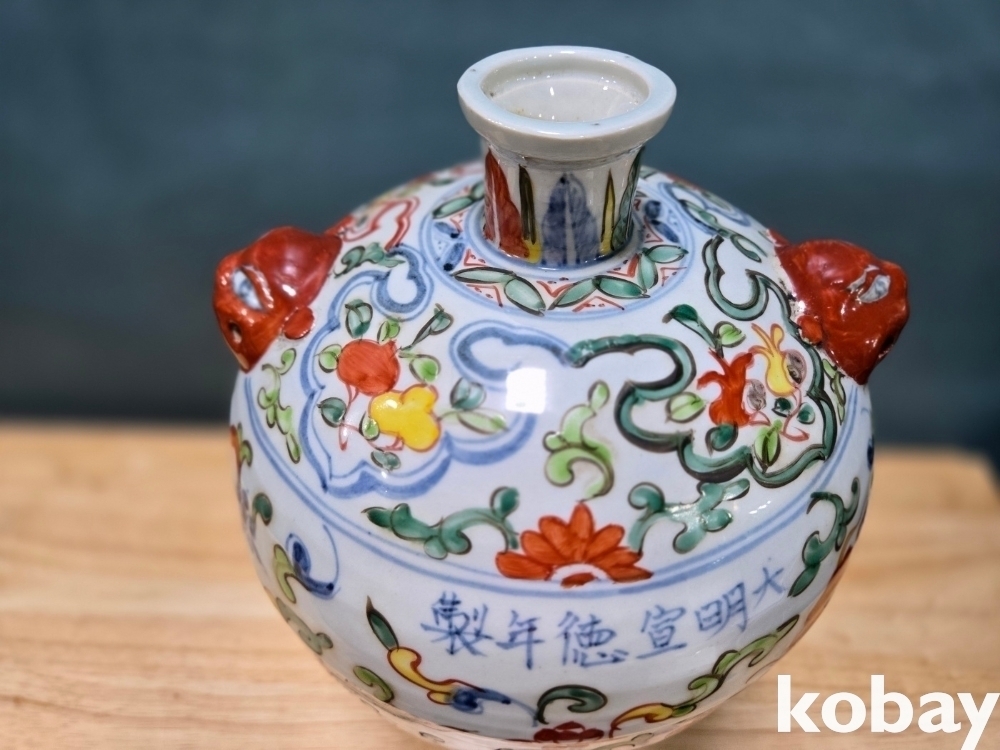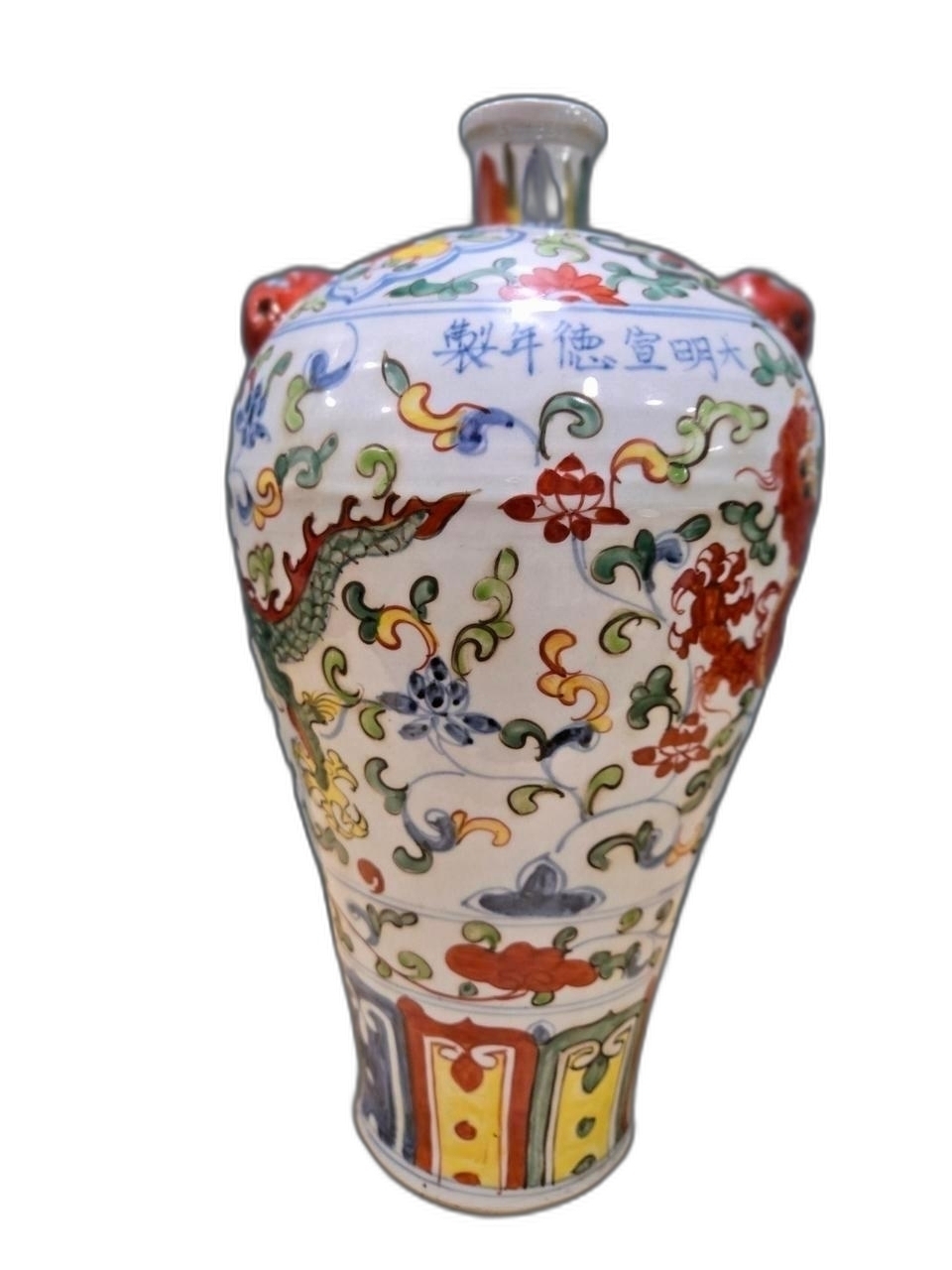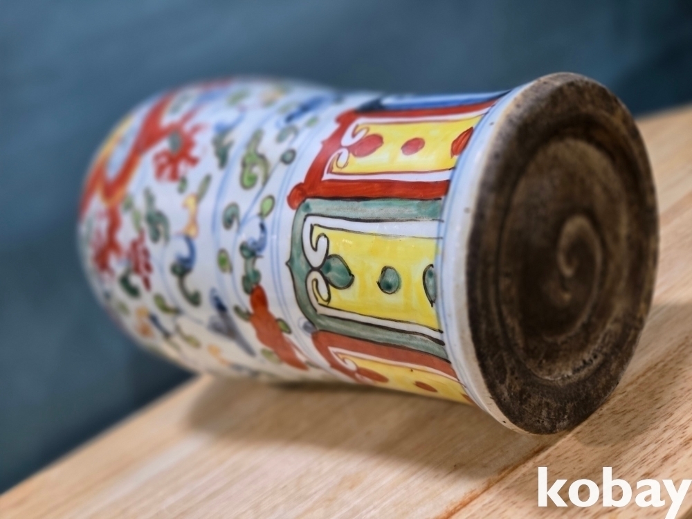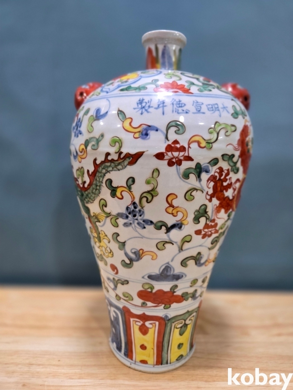 화려한 색상에 용 두마리 표현 매병 도자기 입니다.