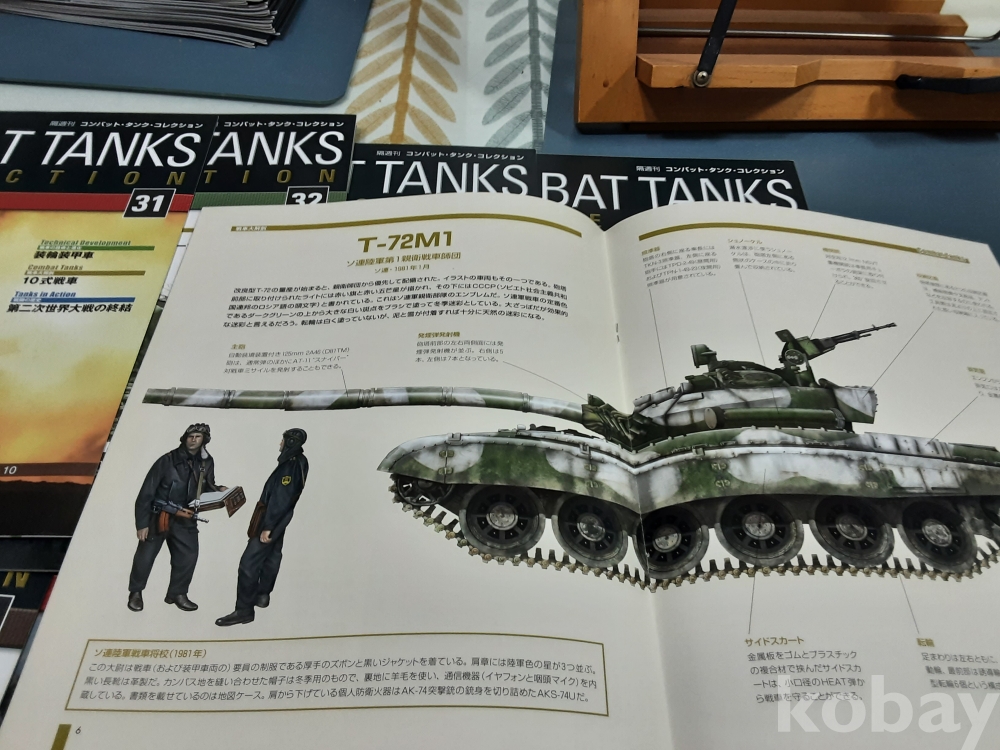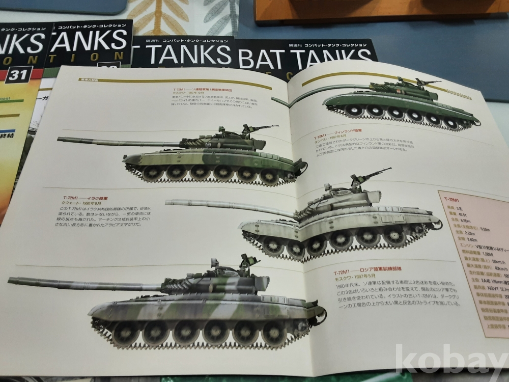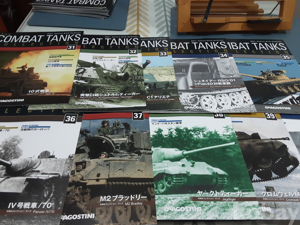1. 데오고스티니(DeAGOSTINI) 전투 탱크 컬렉션은 다양한 국가의 제2차 세계 대전 및 냉전 시대를 대표하는 탱크들을 정교하게 재현한 1:72 스케일의 모형 120종 시리즈로 각 모델에는 디스플레이 케이스, 탱크모형과 잡지가 함께 제공된다. 전세계적으로 수집가들에게 인기가 많은 데오고스티니(DeAGOSTINI) 탱크 모델 해설서인 잡지 전 120종 판매. 31. 10식 전차 32. 돌격포 스툼타이거 33. C1 Ariete 34. Pak 40 대전차포 35. T-72 M1 36. 4호전차 70 37. M2 브래들리 38. 야크트 타이거 39. 크롬웰 Mk.4 40. 돌격포 브룸베르