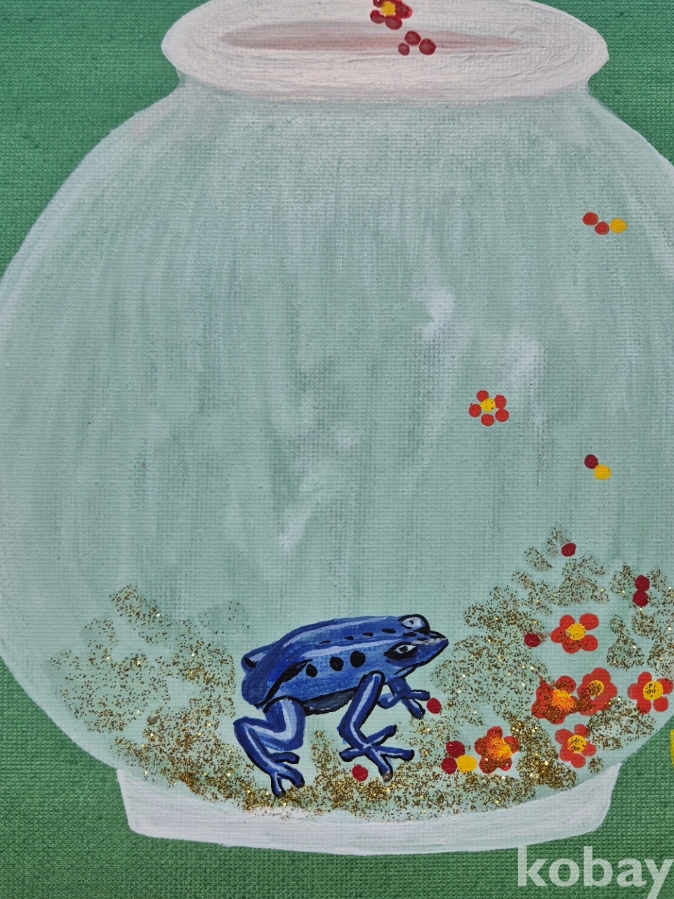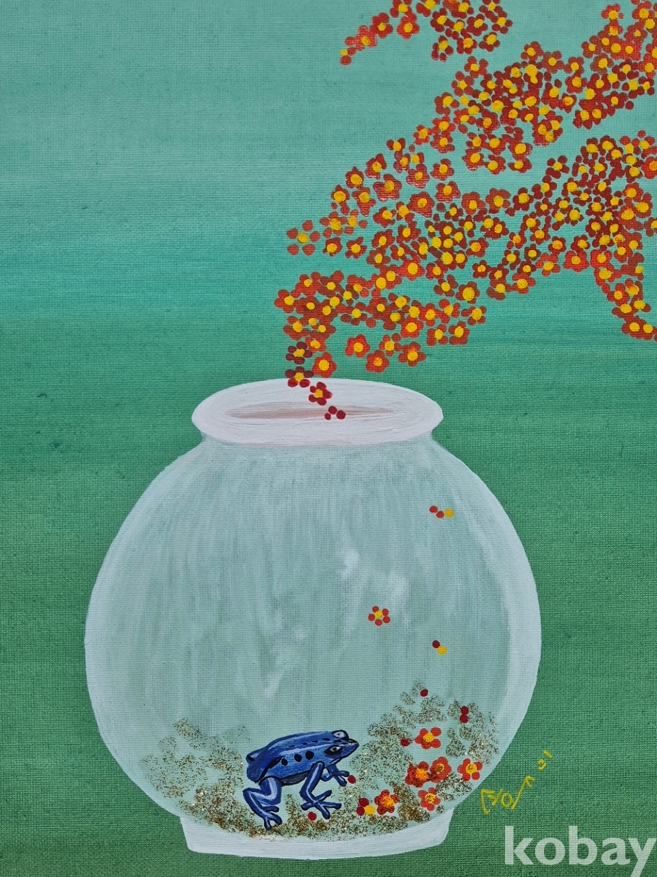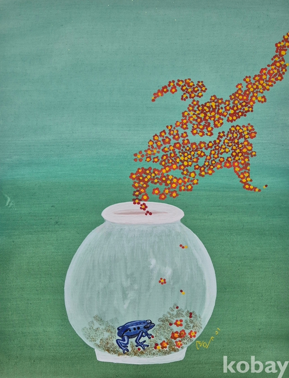 달항아리 형태의 용기 안에 개구리가 배치돼 있으며, 내부와 상단에서 붉은색과 노란색 점들이 흩어지듯 구성돼 있다. 점 형태의 요소들이 흐르며 화면을 채우고, 반복적인 점묘 표현이 두드러진다. 녹색 계열의 배경과 흰색 항아리가 대비를 이루는 구성이 보인다.