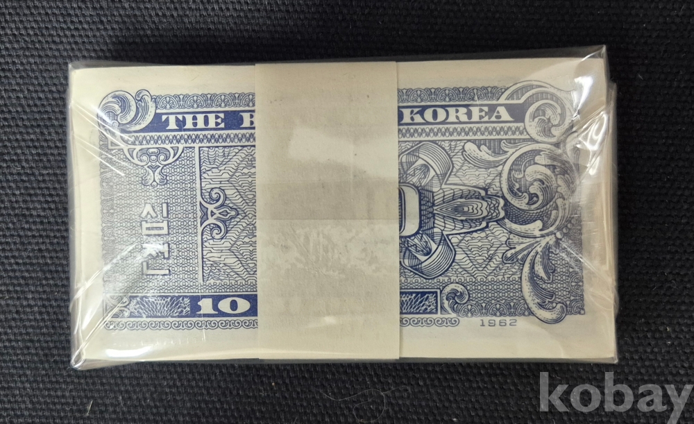 - 한국은행 1962년 최적 액면 십전 판번호 2번 100장 미사용 다발