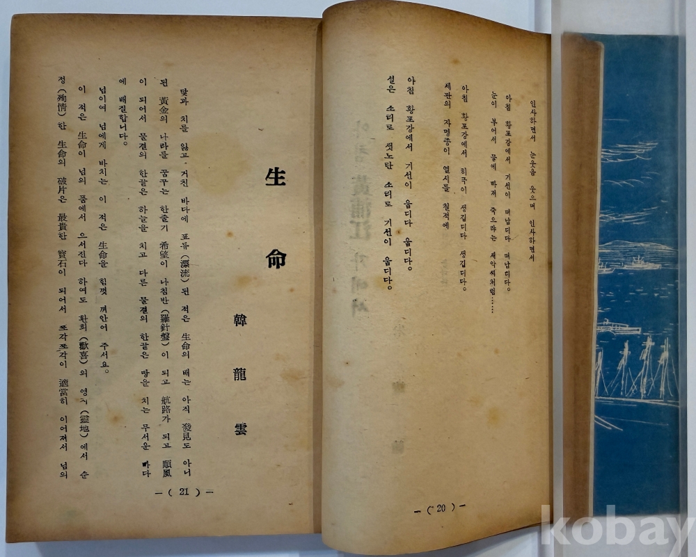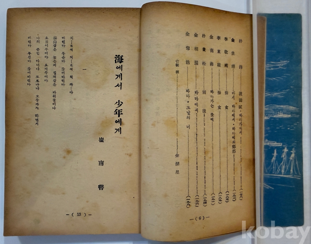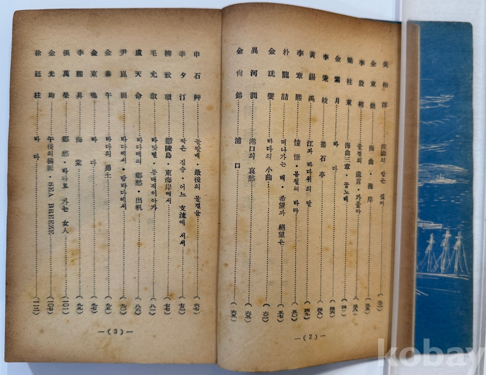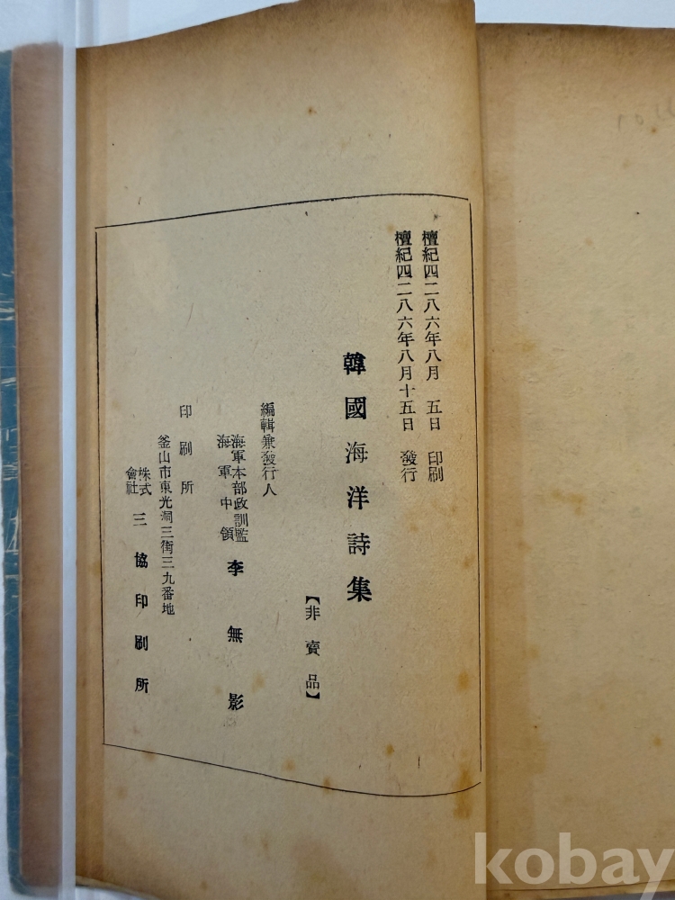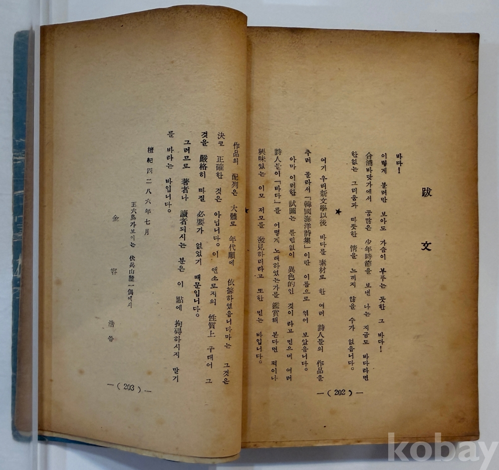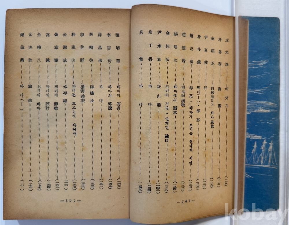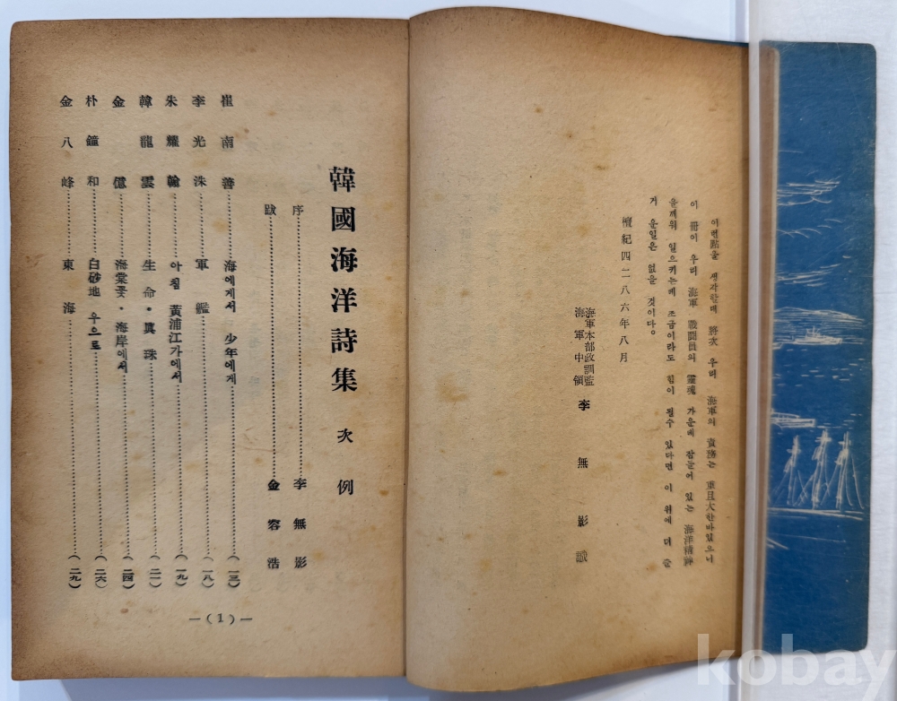 설 명 | 1953년 해군에서 정훈장교로 복무중이던 소설가 이무영이 한국 신시(新詩) 초창기부터 발행 당시까지 바다를 주제로한 시를 모아 발행한 시집이다. 우리 시단에 거두들인 육당(六堂) 최남선(崔南善)의 『해에게서 소년에게』를 비롯하여, 춘원 이광수, 송아 주요한, 만해 한용운, 월탄 박종화, 미당 서정주 등 60여명의 시인들의 시가 게재되어 있다. | |||||