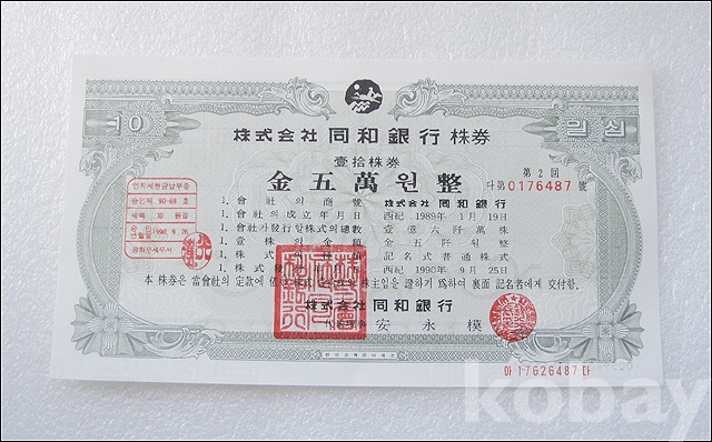 동화은행 50,000원 실물 종이 주식 (823)