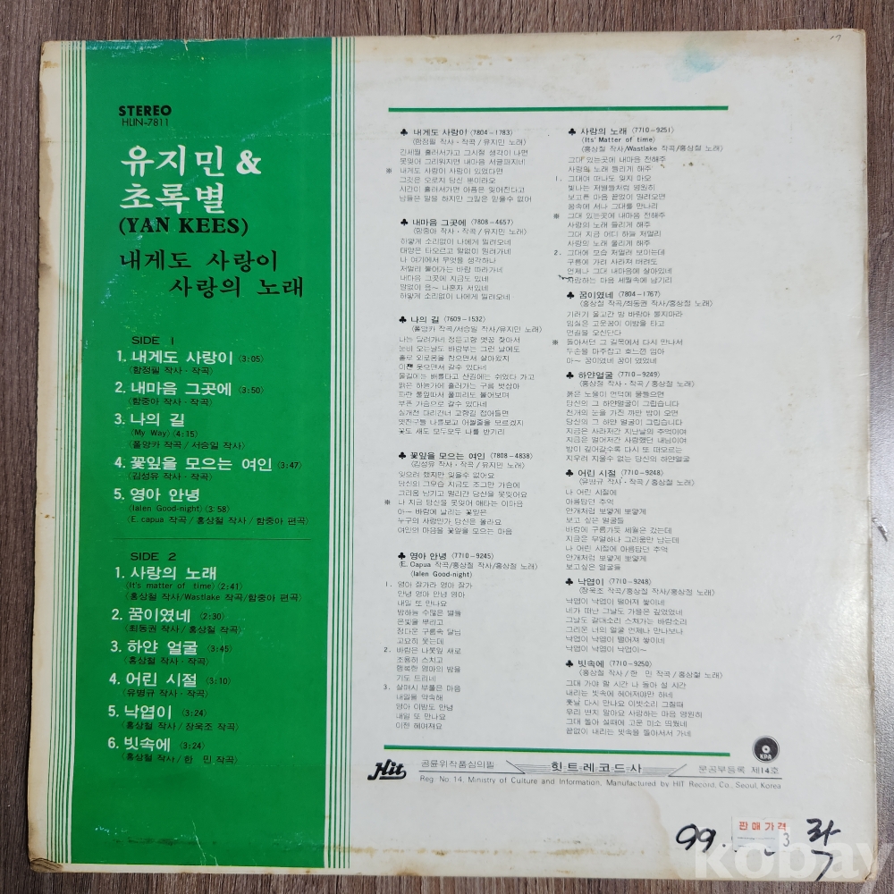 | 자켓상태 | VG : 주름, 접힘, 모서리 찢김 다수 | 음반상태 | EX : 재생에 영향 없는 가벼운 기스 존재 | 발매정보 | 알수없음 | 가사지여부 | 무 |