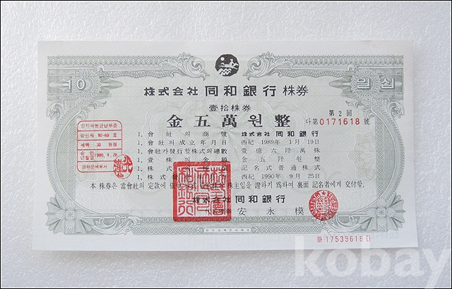 동화은행 50,000원 실물 종이 주식 (804)