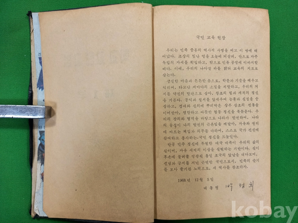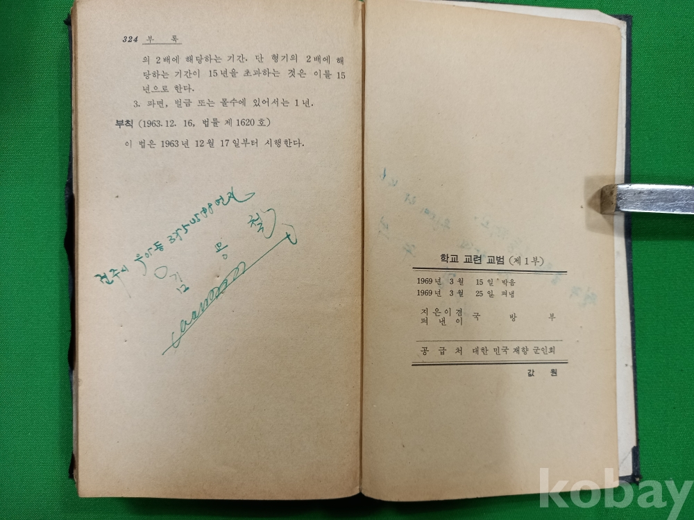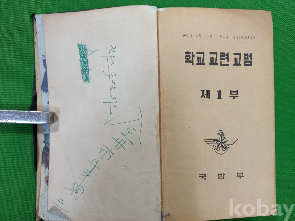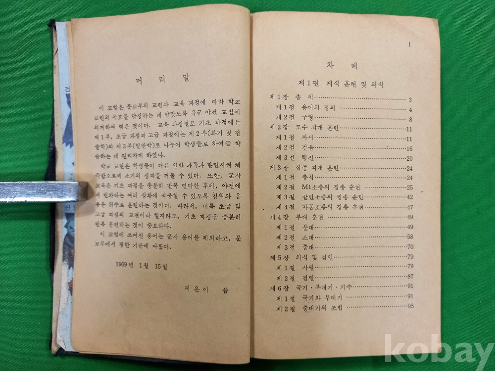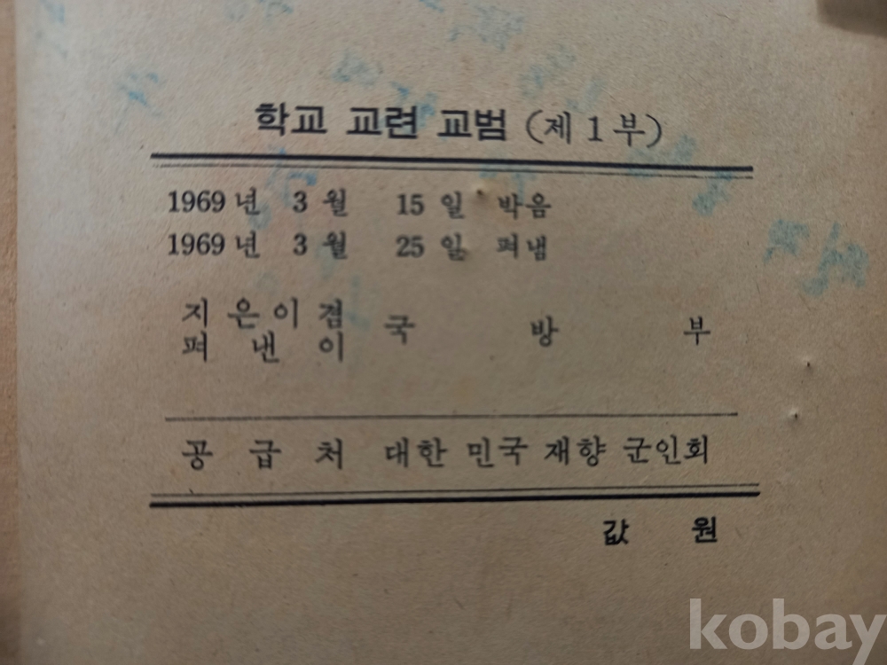 이 책은 1960년대 후반부터 한국 학교에서 실시되었던 '교련(敎鍊)' 과목의 공식 교과서인 《학교 교련 교범 제1부》입니다. 대한민국 국방부에서 발행하였으며, 당시 학생들에게 군사 지식과 훈련 내용을 가르치기 위해 제작되었습니다. 1969년 박정희 정부가 안보 위기에 대응하여 고등학교와 대학교에 필수 과목으로 도입한 군사 교육 과정으로 당시의 엄격했던 사회 분위기와 학생들도 국가 안보의 한 축으로 여겨졌던 한국 현대사의 단면을 보여주는 중요한 자료입니다.