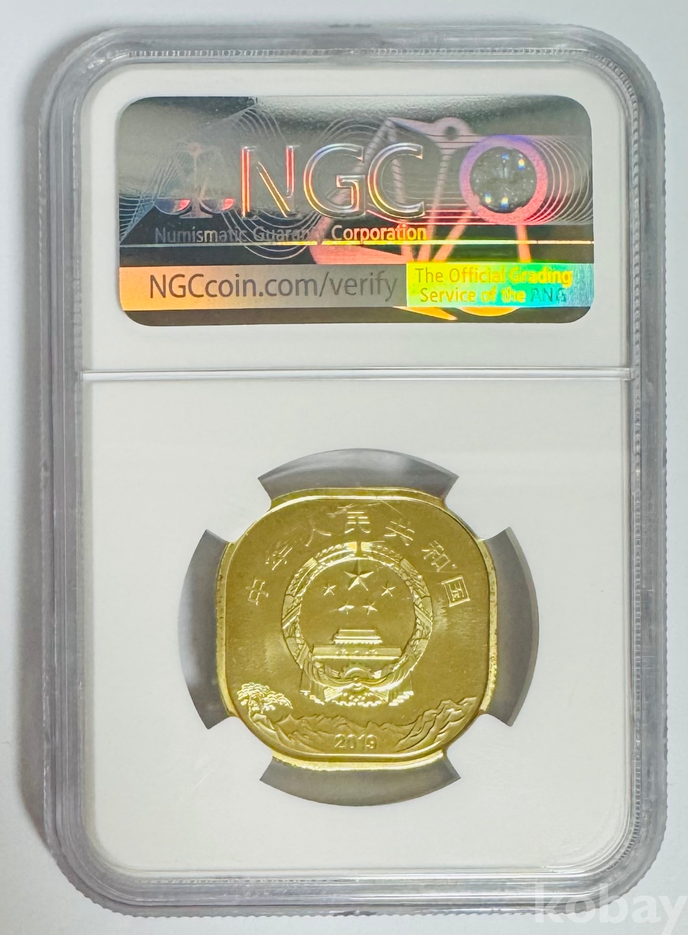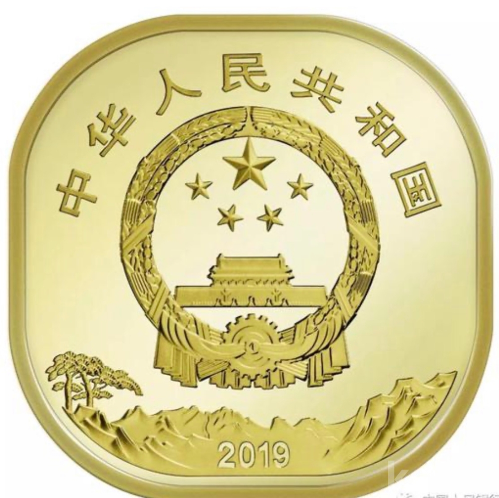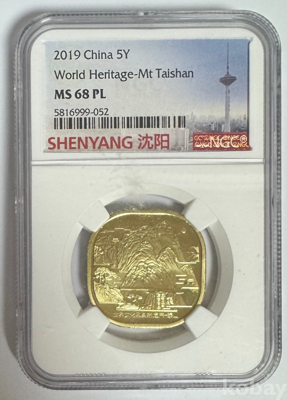 사진의 주화는 2019년 중국 세계유산 태산 5위안 기념주화입니다. 앞면에는 중화인민공화국 국장이 있고, 뒷면에는 태산의 산세와 문화유산 이미지가 표현되어 있습니다. 모서리가 둥근 사각형 형태라 일반 원형 주화보다 디자인적 특징이 뚜렷합니다.