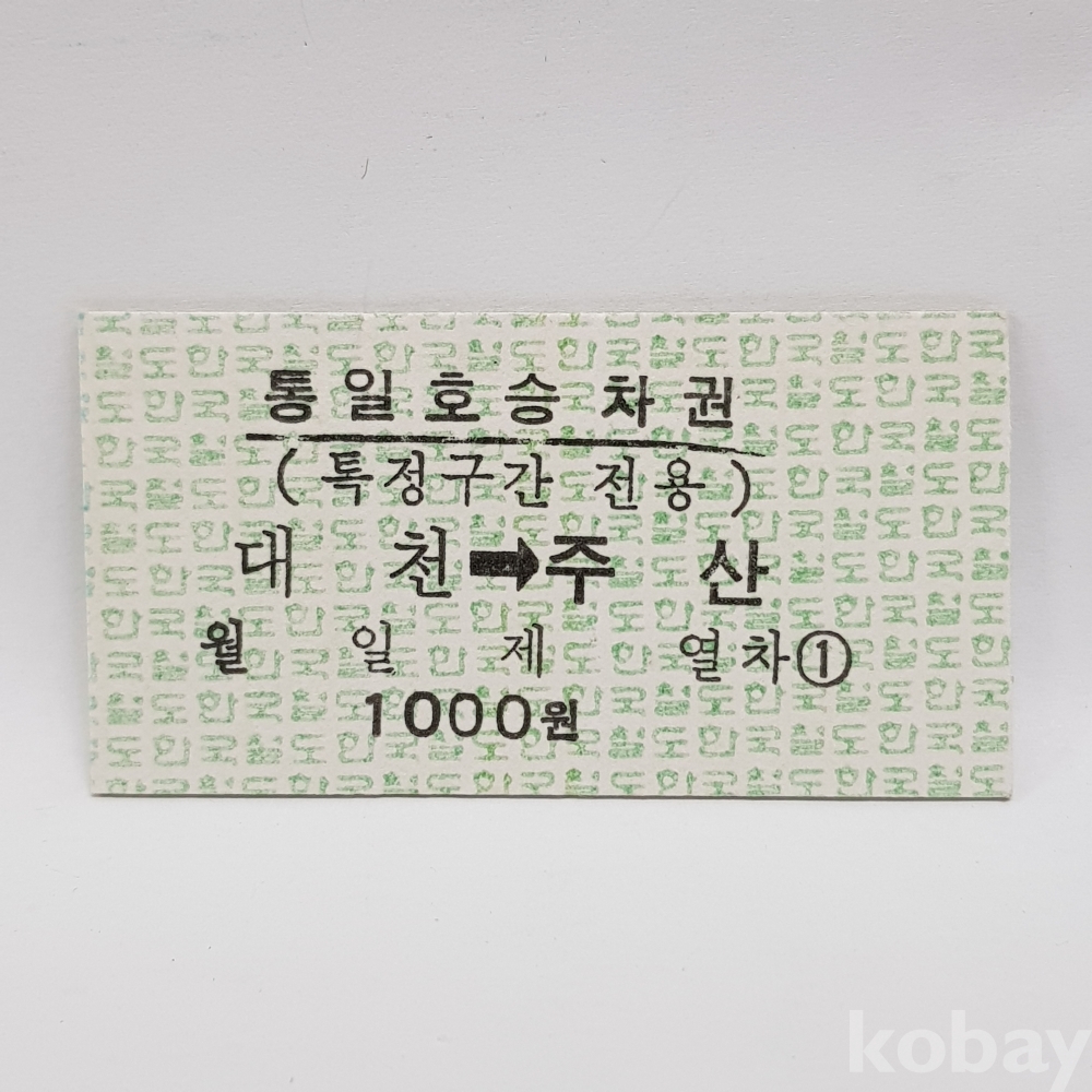 " 대천 ▶ 주산 " 미사용 통일호 승차권(특정구간전용) 1000원