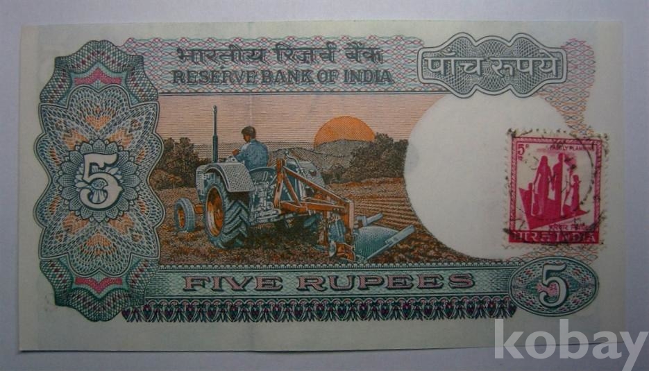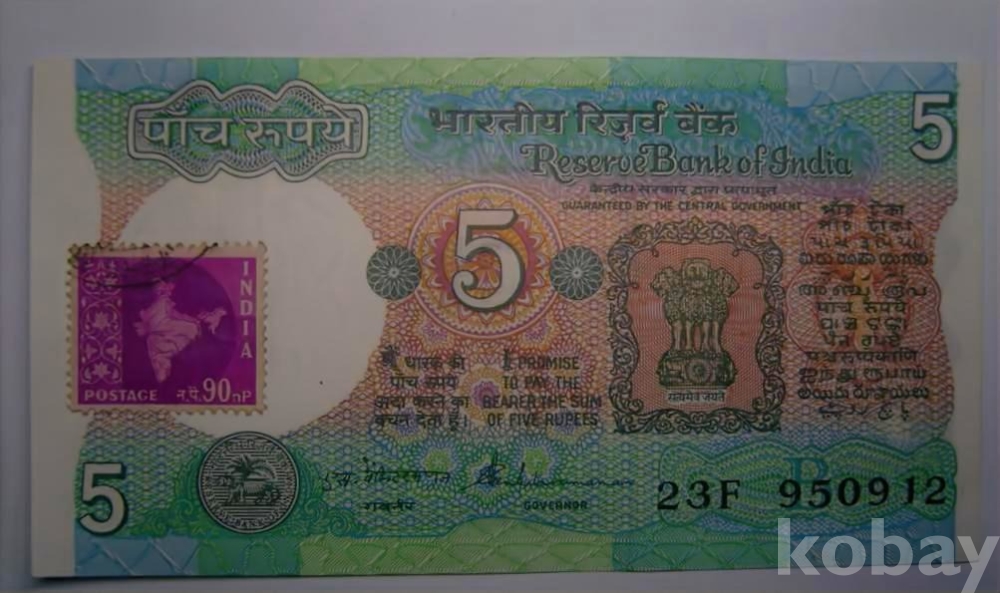 우표가 있는 지폐 인도 5 루피 1975년 (UNC)