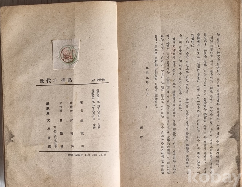 세대의 삽화2-김동명 수필집 1959년초판 일선사 발행 장정 이준
