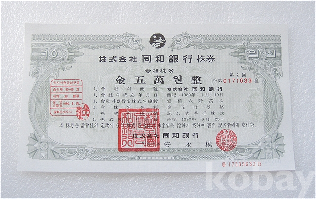 동화은행 50,000원 실물 종이 주식 (815)