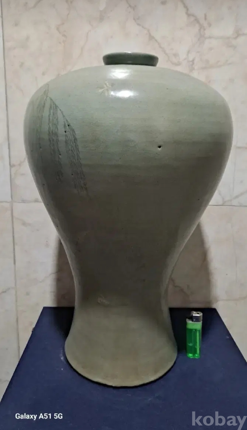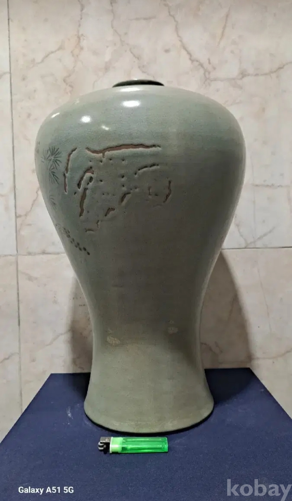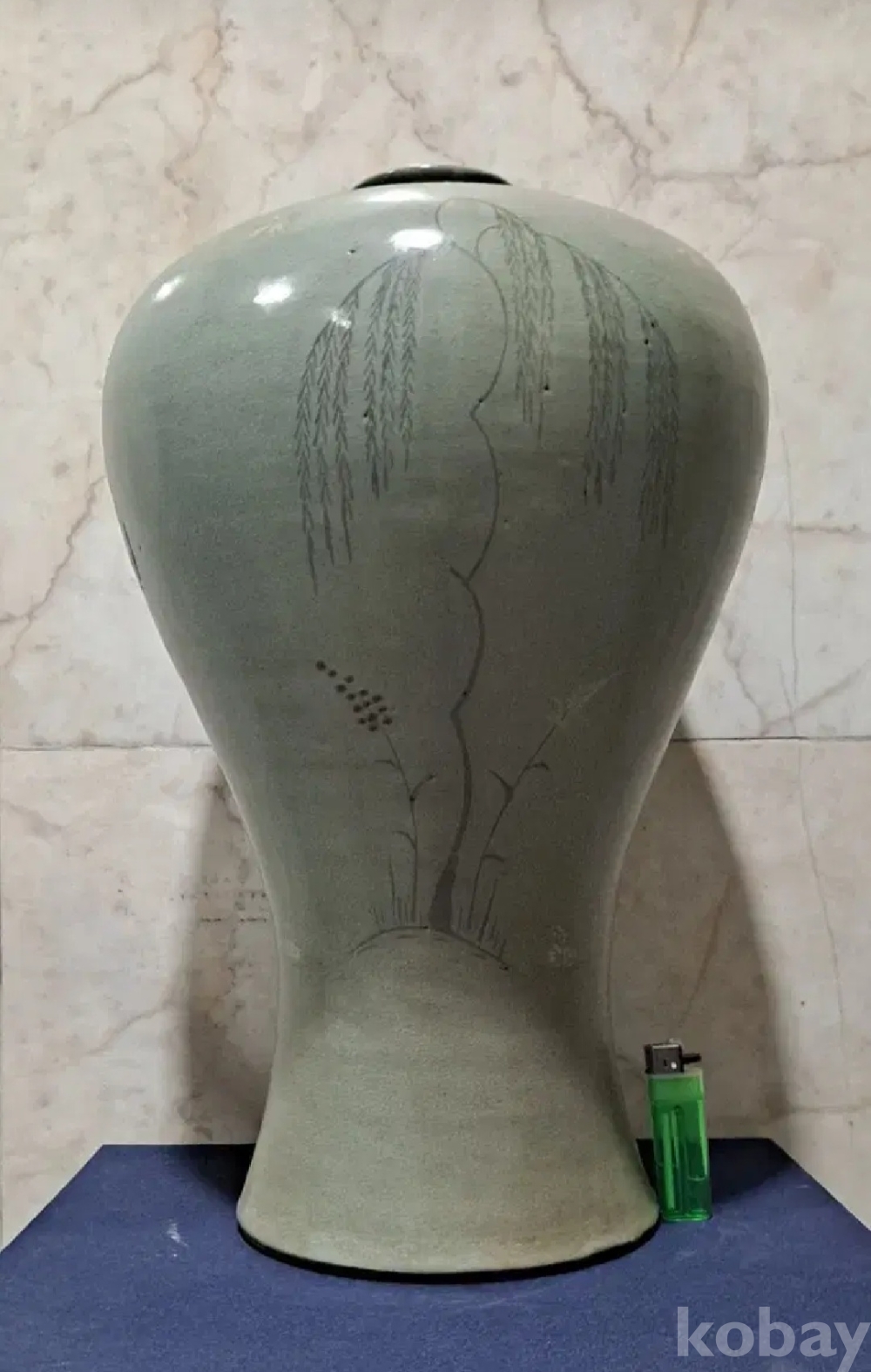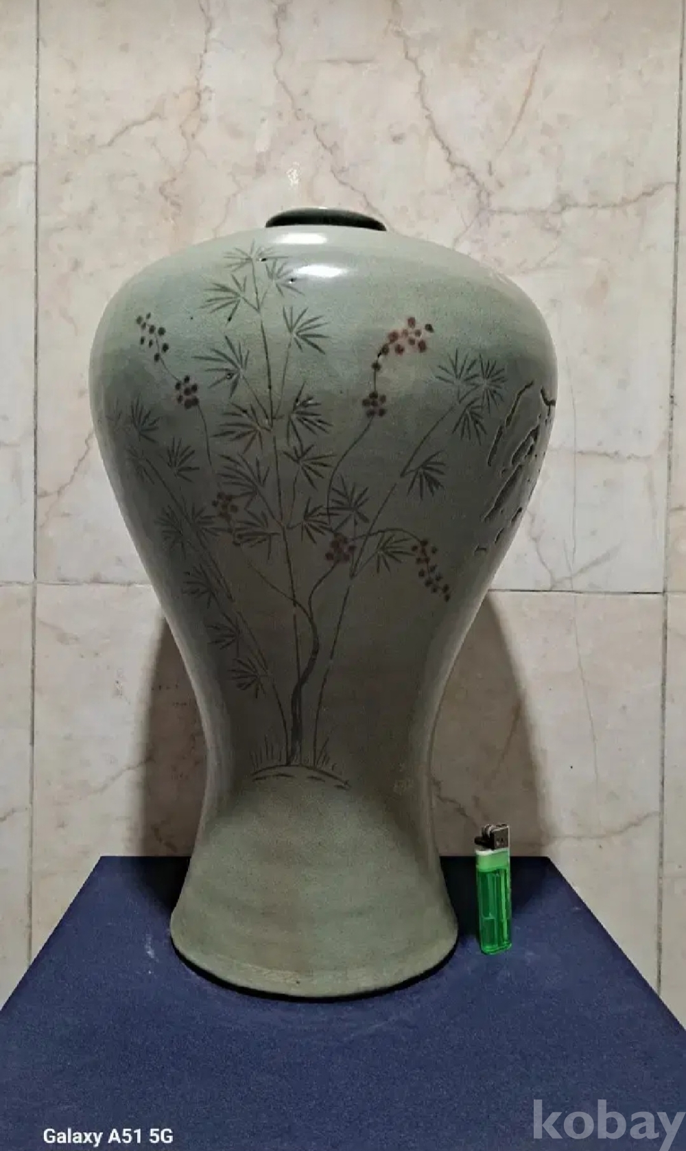높이 약46cm 입구지름 약7.5cm 밑지름 약18.5cm 크기의 깨지거나 수리없이 상태 완전한 웅장하고 아름다운 상감청자 느티나무 그림이 그려진 대형 매병 도자기 입니다. 유약이 없는 부분 사진은 손상이 아니라 유약이 말린 자욱 이랍니다. 이렇게 크고 멋진 도자기를 거실이나 사무실에 장식품으로 비치하시면 정말 멋질것 같습니다.