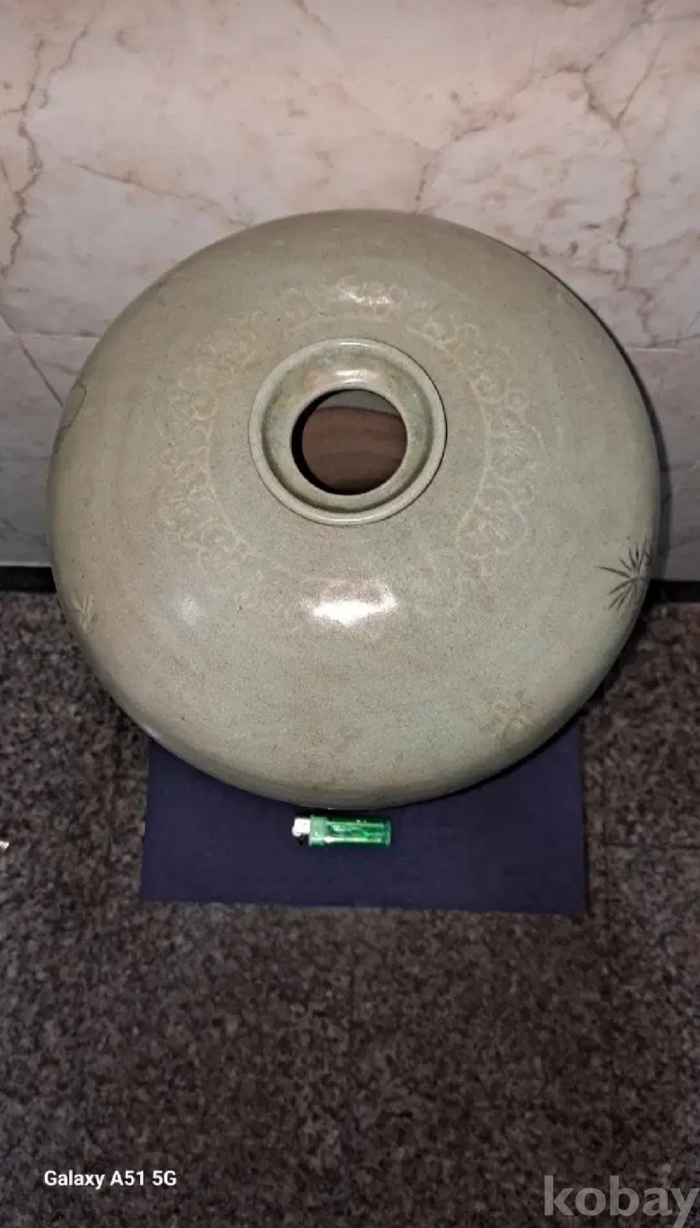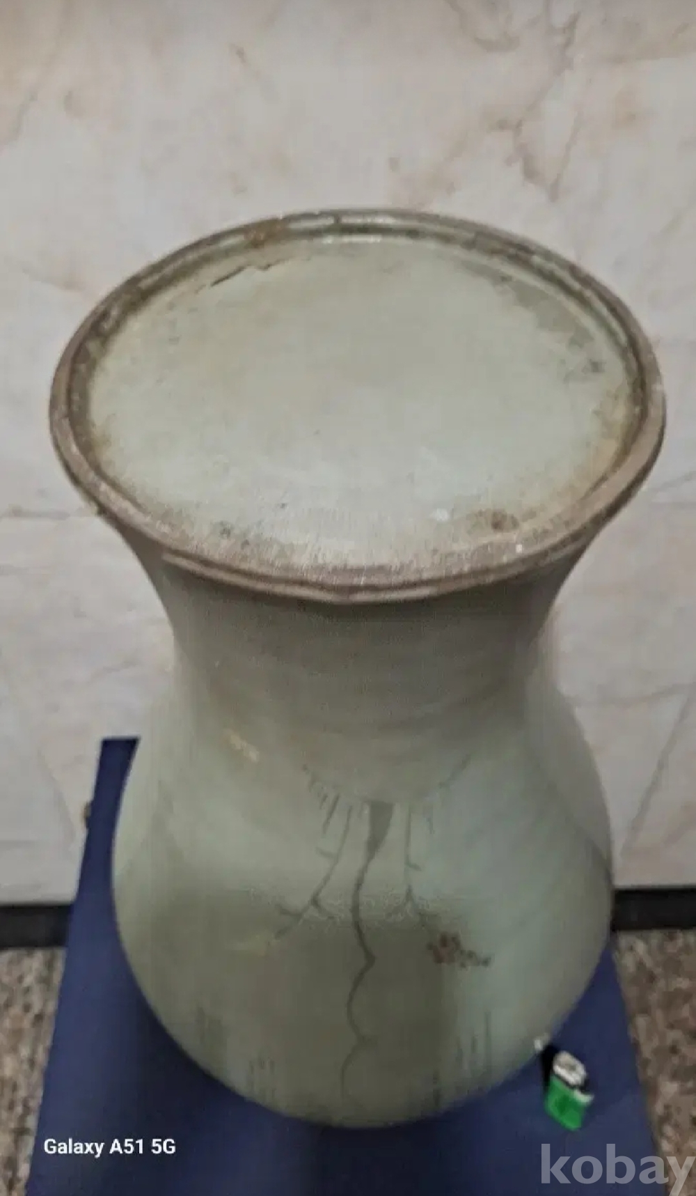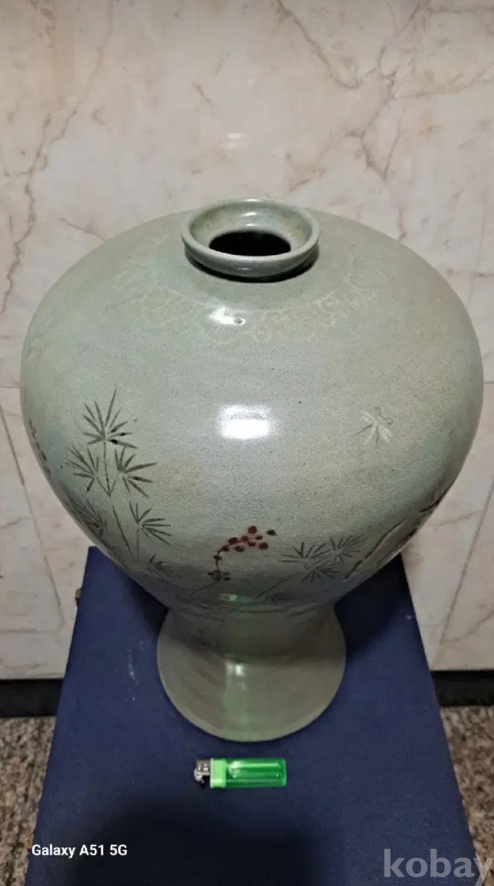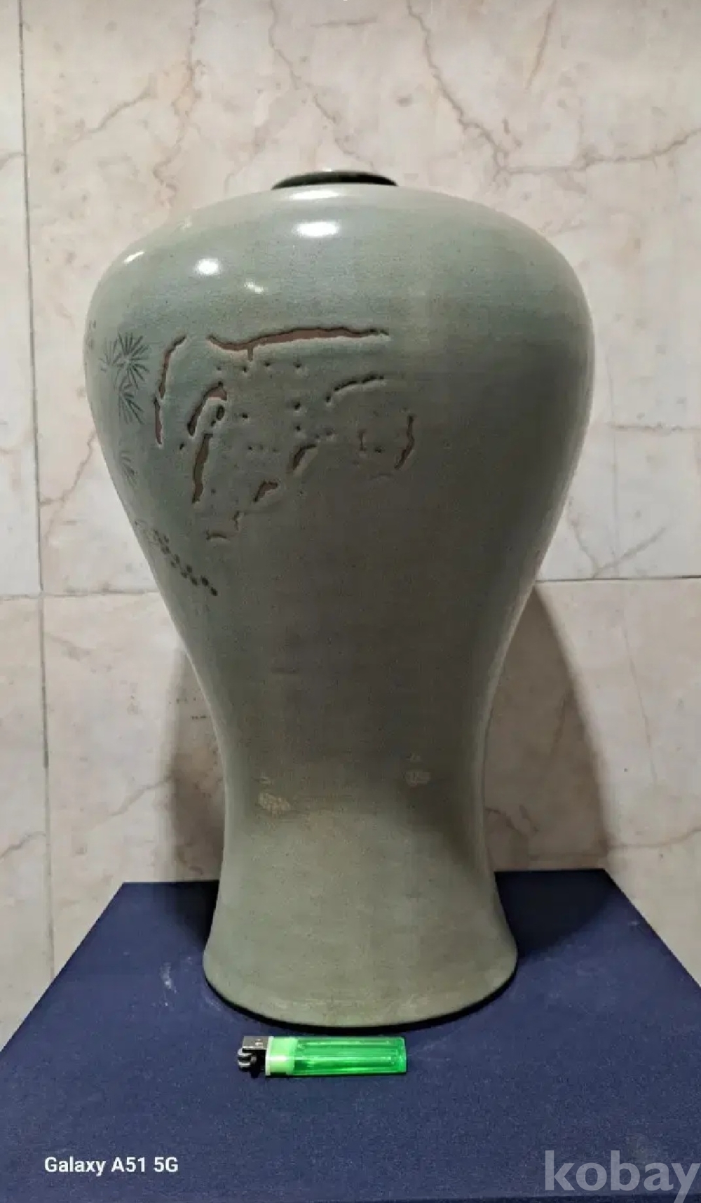 높이 약46cm 입구지름 약7.5cm 밑지름 약18.5cm 크기의 깨지거나 수리없이 상태 완전한 웅장하고 아름다운 상감청자 느티나무 그림이 그려진 대형 매병 도자기 입니다. 유약이 없는 부분 사진은 손상이 아니라 유약이 말린 자욱 이랍니다. 이렇게 크고 멋진 도자기를 거실이나 사무실에 장식품으로 비치하시면 정말 멋질것 같습니다.