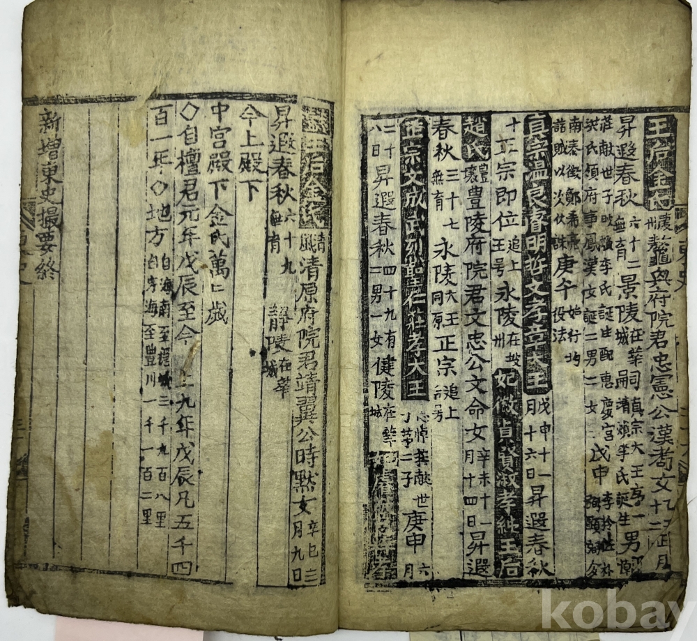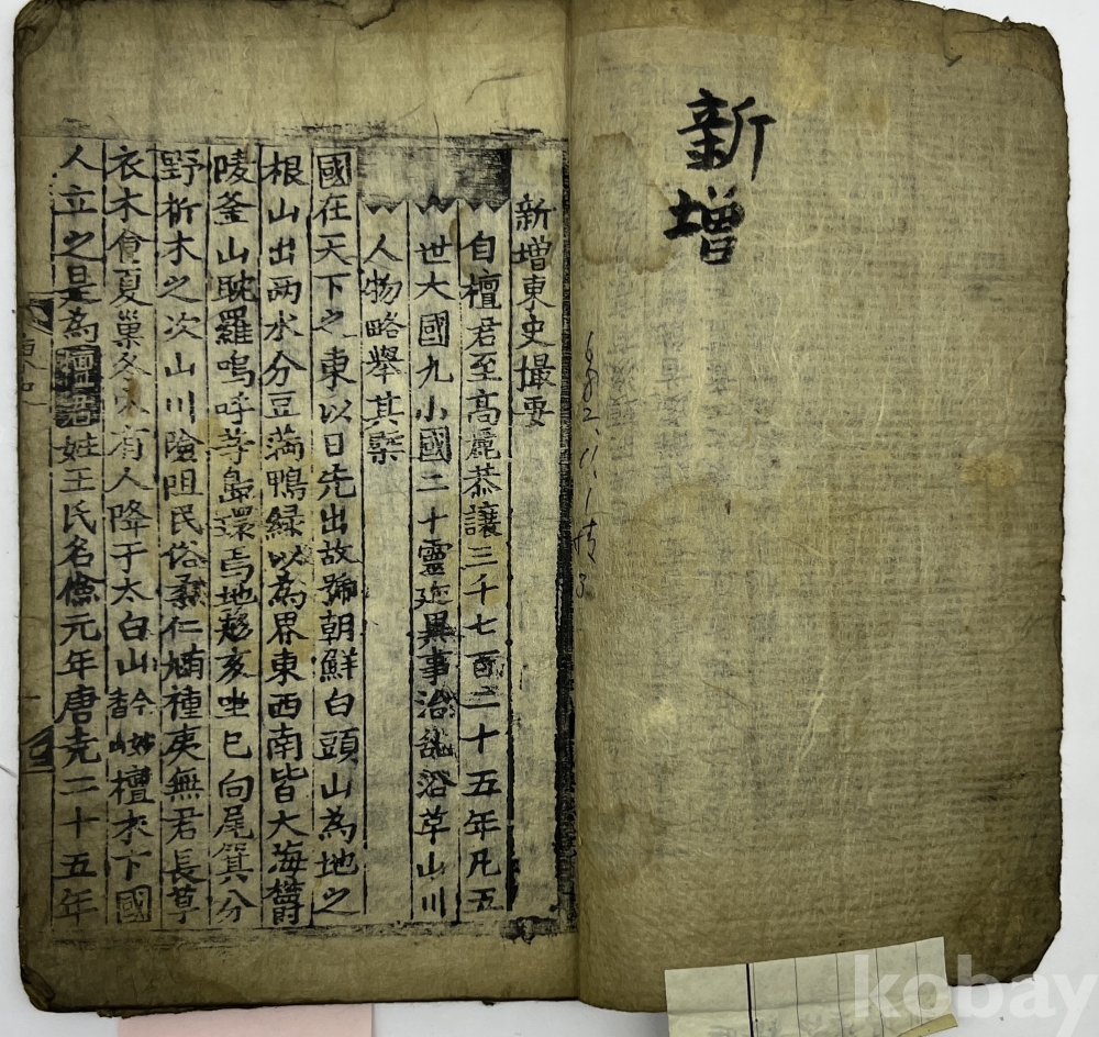 설 명 | 기존의 단군조선부터 고려 공민왕까지 다룬 동사촬요(東史撮要)에 더해(新增) 조선 정조((正宗文成武烈聖仁莊孝大王)까지의 한국 역사를 요약하여 기술한 역사서이다. 소형 목판본으로 말미에 ‘갑신중추개판(甲申仲秋開版) 간기가 있다. | |||||
