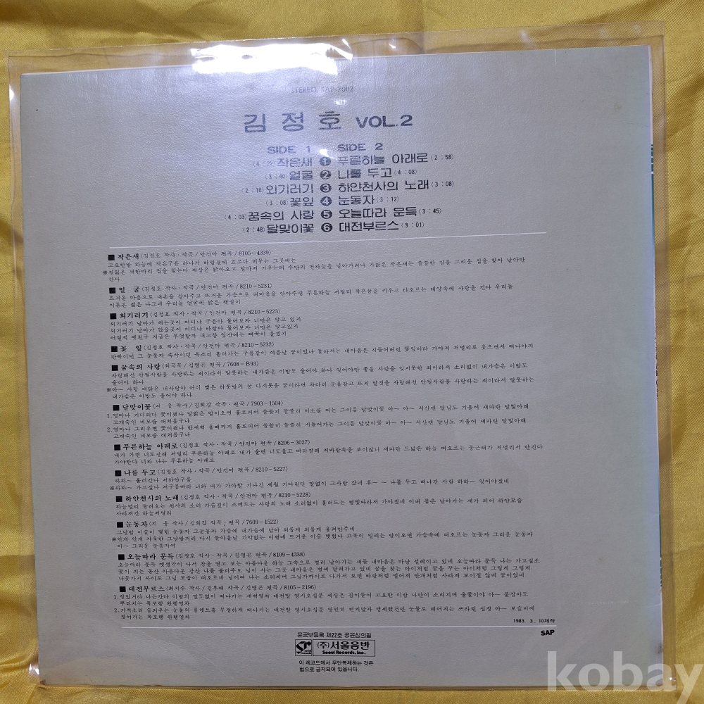 | 자켓상태 | EX : 약간의 마모, 모서리 찢김 존재 | 음반상태 | EX : 재생에 영향 없는 가벼운 기스 존재 | 발매정보 | 알수없음 | 가사지여부 | 유 |