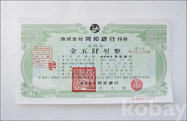동화은행 5,000원권 실물 종이 주식 (803)