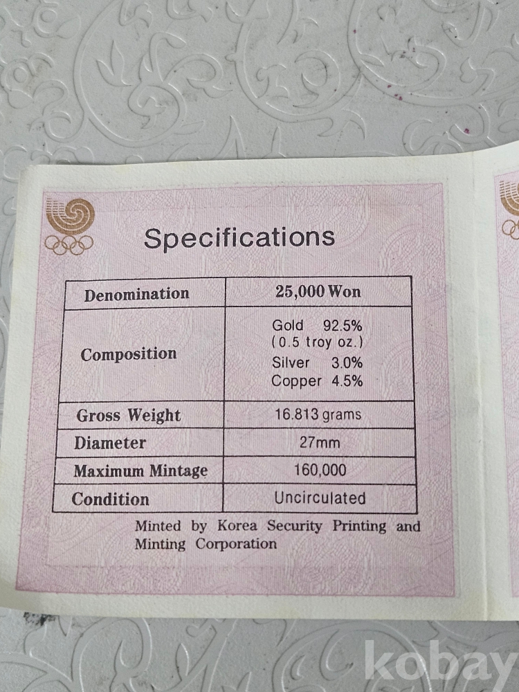 ㅡ1988년 서울올림픽을 기념하여 한국은행에서 발행한 정품 기념 금화입니다.