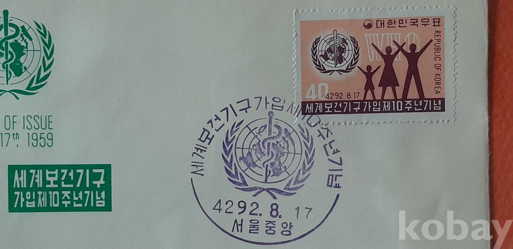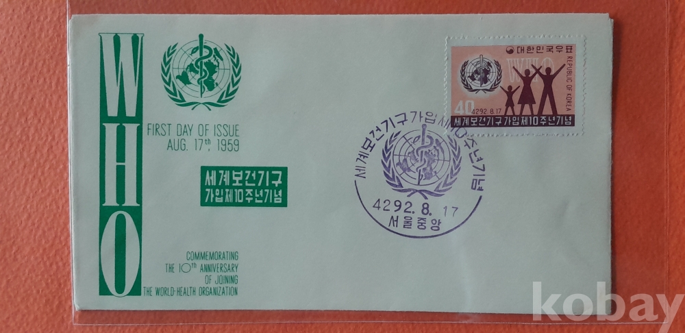 1959년 발행 세계보건기구 가입 10주년 기념 초일봉피 입니다.