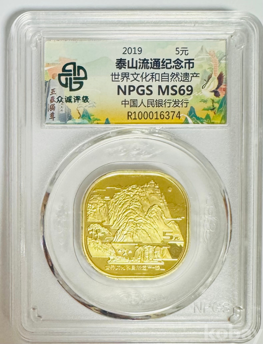 2019년 중국의 태산(泰山) 세계문화·자연유산 5위안 유통기념주화를 NPGS MS69 슬랩에 넣은 모습입니다. 한 장은 태산 산세와 풍경을 담은 기념도안 면이고, 다른 한 장은 중화인민공화국 국장이 들어간 앞면입니다. 수집용 은화가 아니라 유통기념주화 계열의 현대 중국 기념주화로 보는 것이 맞고, 태산이 중국의 대표적인 문화·자연유산이라는 상징성을 강조한 타입입니다.