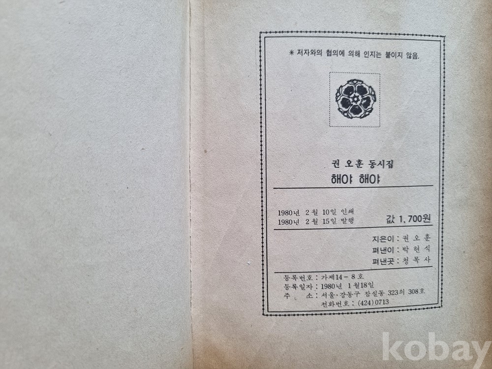 1980년 청목사에서 발행된 권오훈 시인의 귀한 동시집 『해야 해야』입니다.