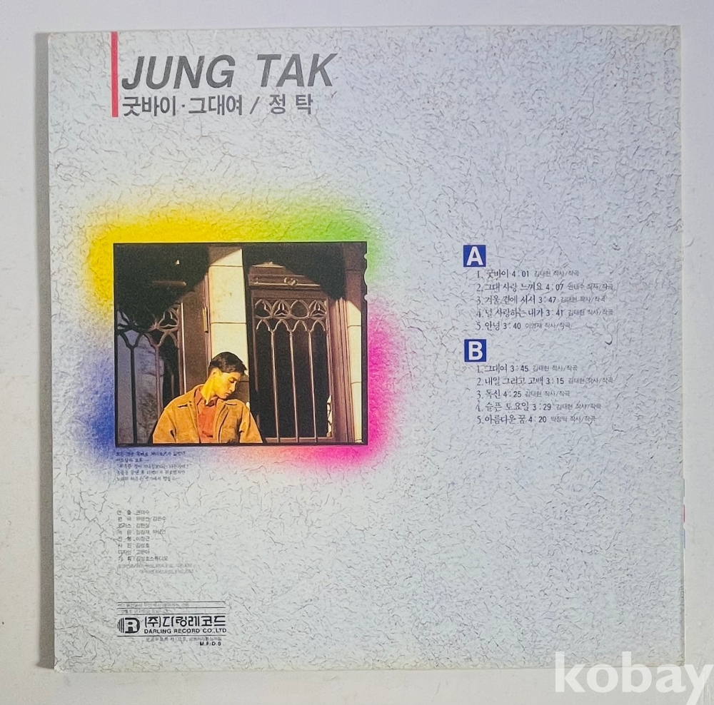1991년 달링레코드에서 발매된 가수 정탁의 데뷔 앨범입니다. 김태현 작사/작곡의 '굿바이'와 '그대여' 등 서정적인 발라드와 팝 스타일의 곡들이 수록되어 있습니다. 당시 소량 발매되어 현재는 구하기 힘든 희귀 LP로, 수집 가치가 매우 높습니다. 자켓부터 알판까지 상태가 매우 좋아 소장용으로 강력 추천드립니다.