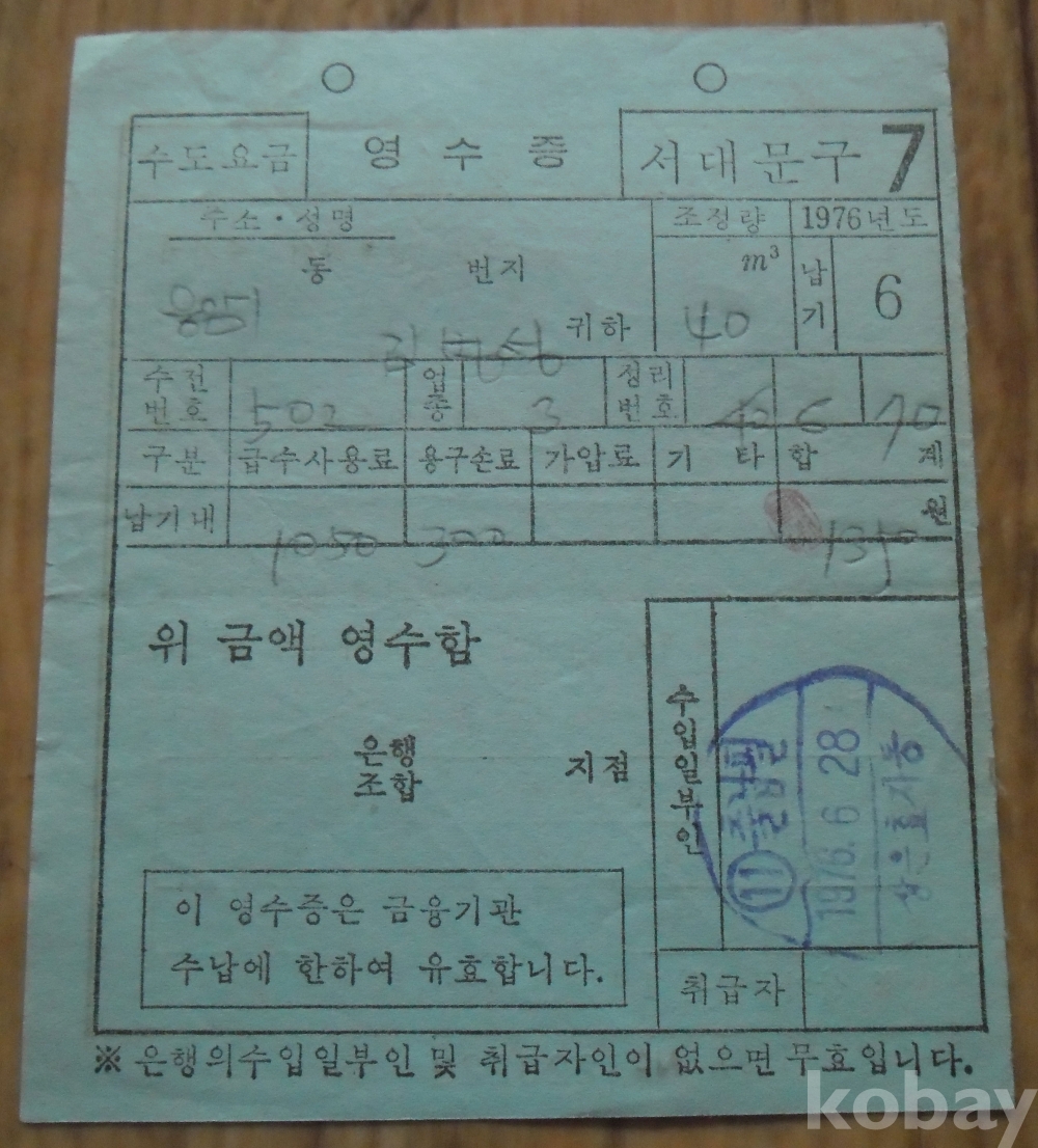 1976년 서대문구 수도요금 영수증