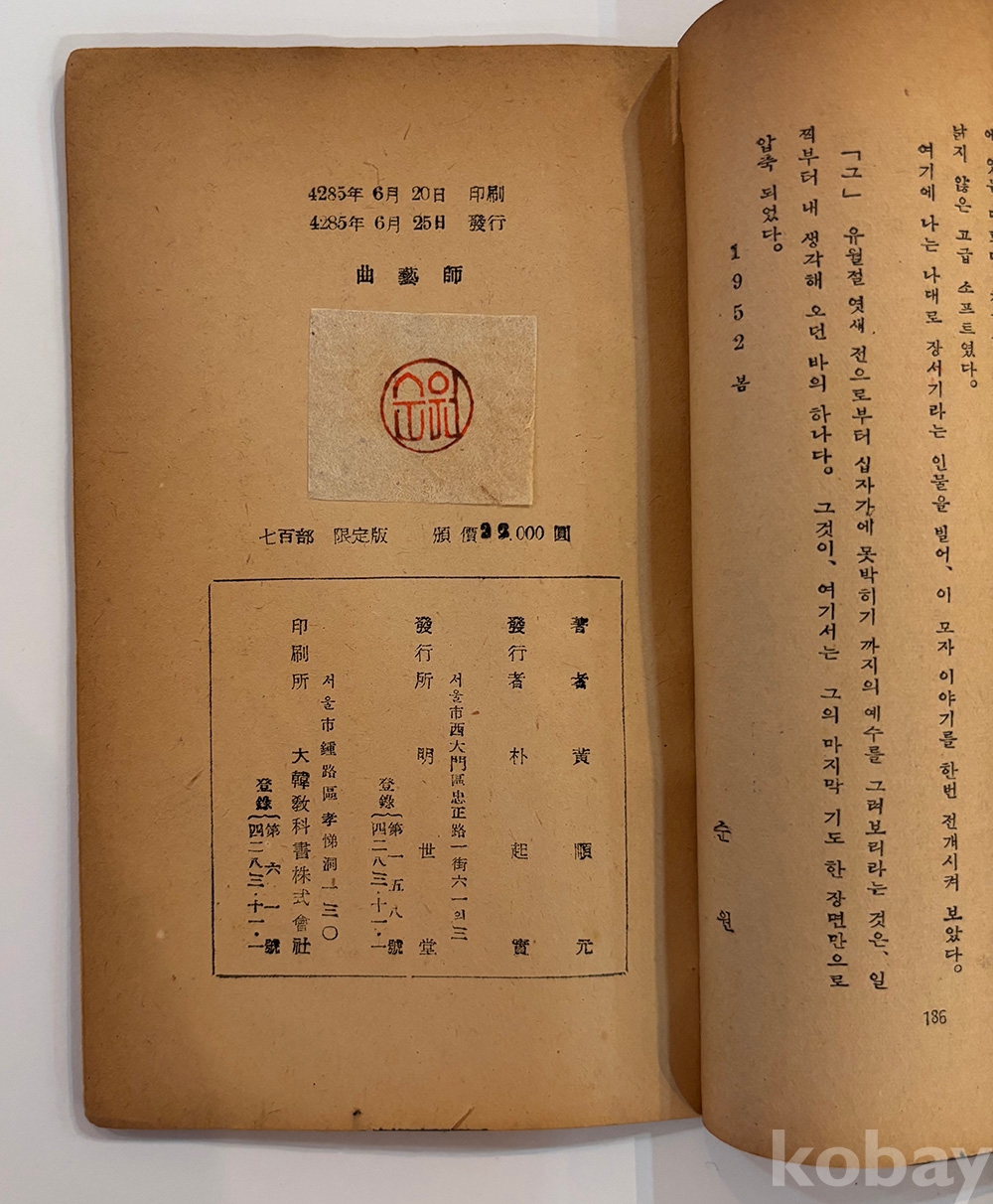 물 품 명 | <취향지가> [28] 1952년 발행, 6.25 비극을 담음 황순원의 소설 [곡예사(曲藝師)] 700부 한정판 초판본 1책 | |||||
