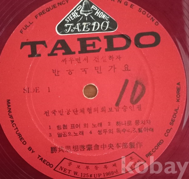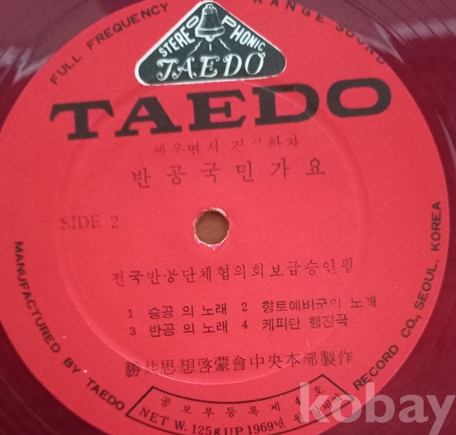 이런 종류의 음반, 제3,4공화국의 박정희대통령때 많이 나왔지. 새마을, 건전가요, 군가등 몇종이 있었는지도 모르겠네요. 온/오프 라인 시장에서 가끔씩 그야말로 가물에 콩나듯 한 장씩 안보이던것들, 보곤 가능하면 가질려고 노력했지만 참 마음대로 안돼 안타까웠던 적 많았지요. 거개가 다 놓쳤으니.. 오늘도 그동안 오매불망, 찿아 헤매던 두장을 점찍어 둔지 10여일, 입찰했다가 한 장은 놓치고 겨우 한 장만 건졌고. 그래도 한 장이라도 건진게 어딘지 모르고.. 낙찰받지 못한 盤도 다음이 언제가 될란지 몰라도 다시 한번 더 만나게 된다면 반드시 가지기로 다짐을 하고. 대한민국 군가반과 함께 이런 음반들 전문수집가니 만큼. 그런데 이런건 정말로 보기기 하늘에 별따기라서. 참 68년도에 이 단체에서 만든 ”反共의 노래“ 7”싱글반도 있었는데. 그 해는 또“건설의 해“였다 하고.. 그러니까 이 음반보다 7”반이 먼저 나왔던 것으로 보이고.