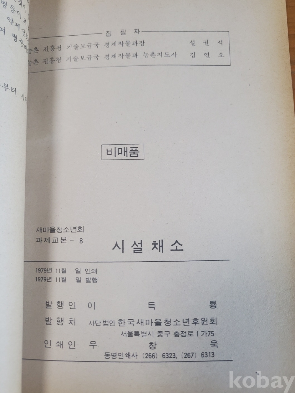 1. 새마을 청소년회 과제교본 8 - 시설채소, 한국새마을청소년후원회, 1979년, 58쪽, 비매품, 상태 상, 사진 참조