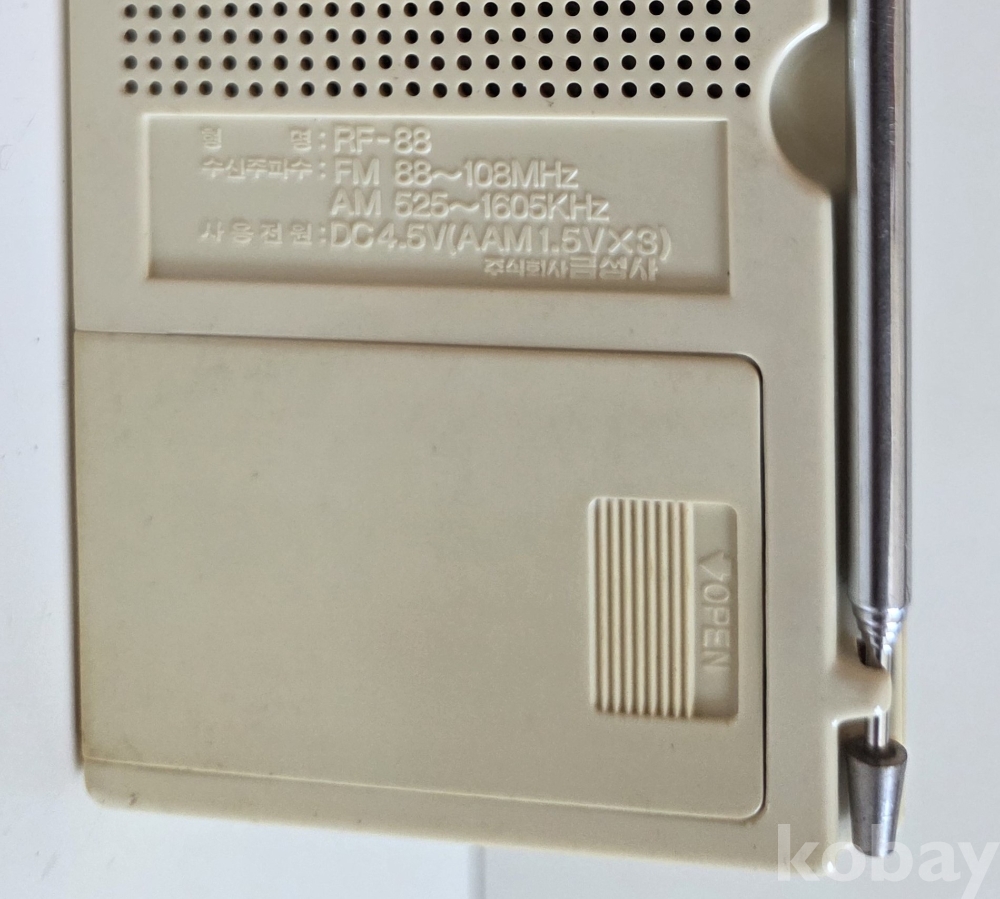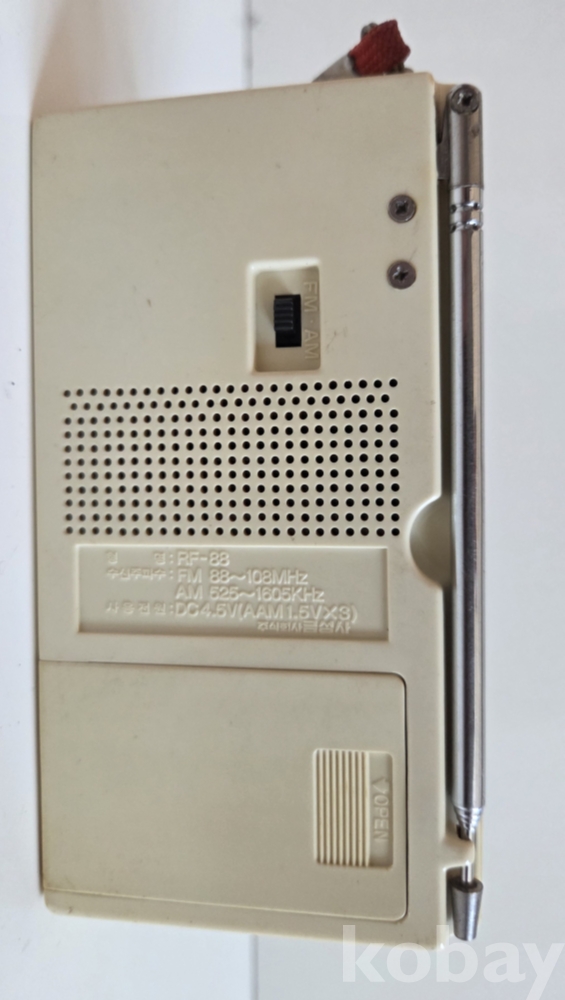 제 품 설 명 | ▣. 금성사에 제조한 소형 휴대용 라디오로 88올림픽을 겨냥한 듯 모델명이 RF-88이며 AM/FM 모두 정상적으로 동작합니다. ▣. 흰색으로 작은 스크레치가 있으나 파손 부분은 없습니다 ▣. AM(중파)는 주파수 특성상 밤과 낮 또는 지역에 따라 수신의 편차가 있을 수 있음. ▣. 신용거래를 위해 내부 사진 첨부하였으며 기타 부분은 첨부한 사진을 참고하시길 바랍니다. ▣. 기타 부분은 오래된 라디오이므로 사진을 충분히 검토하시길 바라며 미입금 사례가 없으시길 정중히 부탁드립니다. |