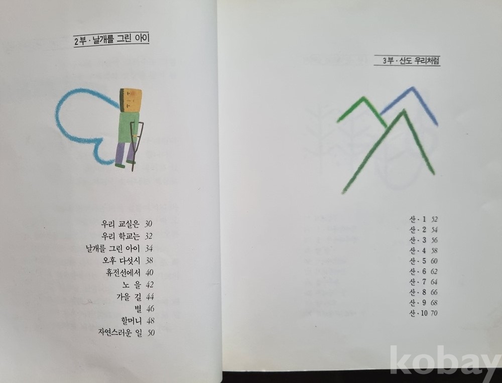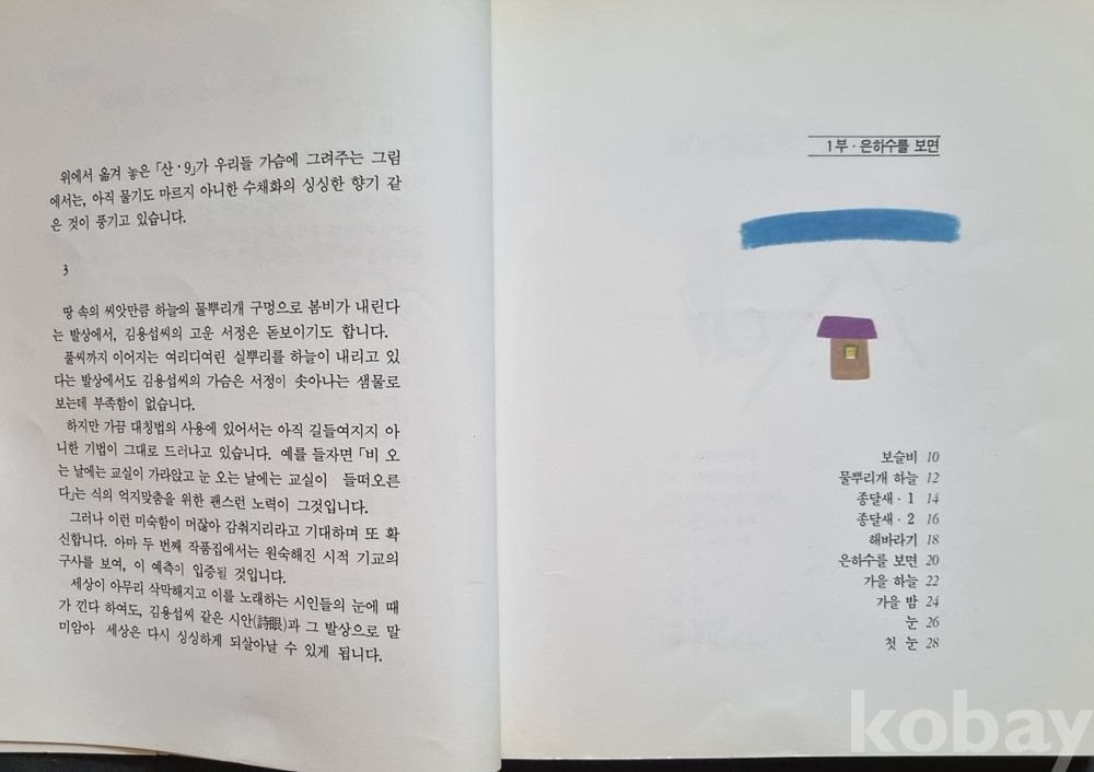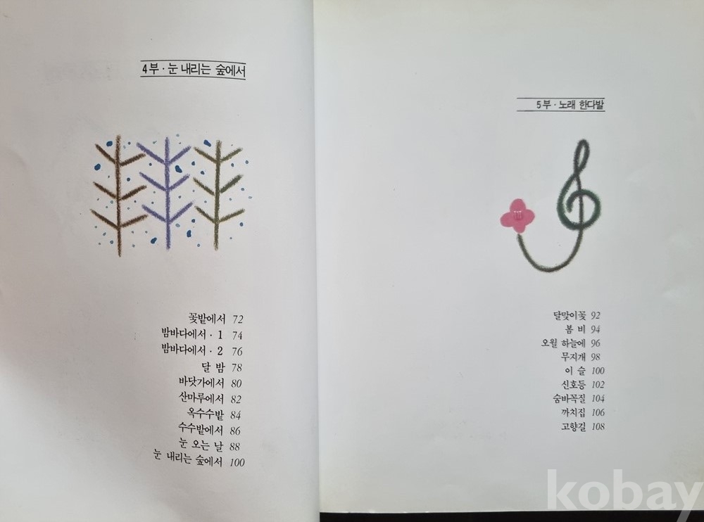 총 5부(은하수를 보면, 날개를 그린 아이, 산도 우리처럼, 눈 내리는 숲에서, 노래 한다발)로 구성된 시화집입니다.