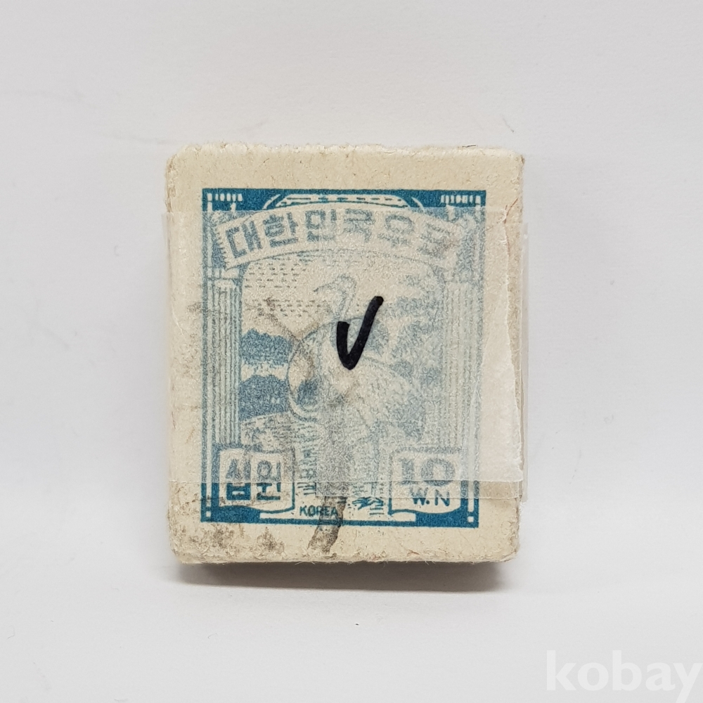 - 1949년 제 1차 원화 학 10원 보통우표 일부인 미확인 사용제 우표 약 100매 묶음