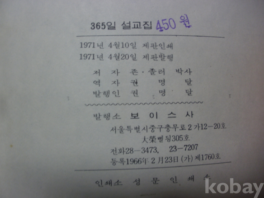 365일 설교집 - 교역자를 위한 설교의 지침 (1971년, 죤.졸러 박사저, 보이스사)