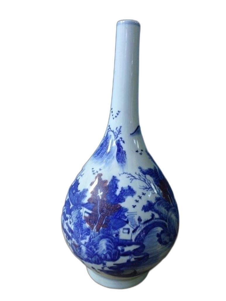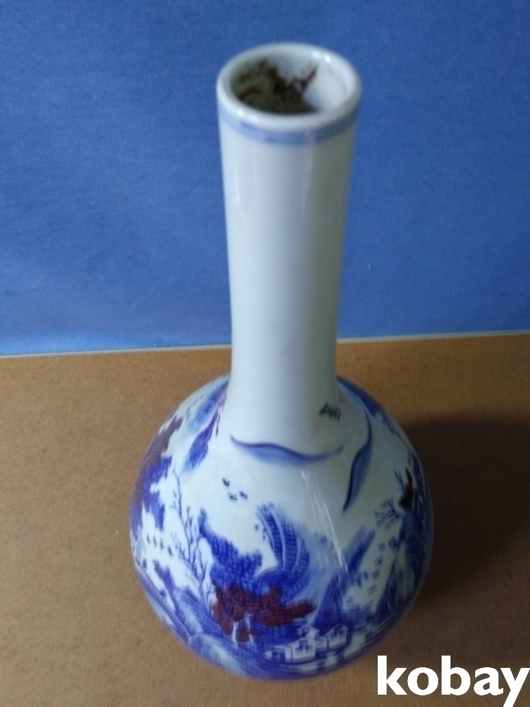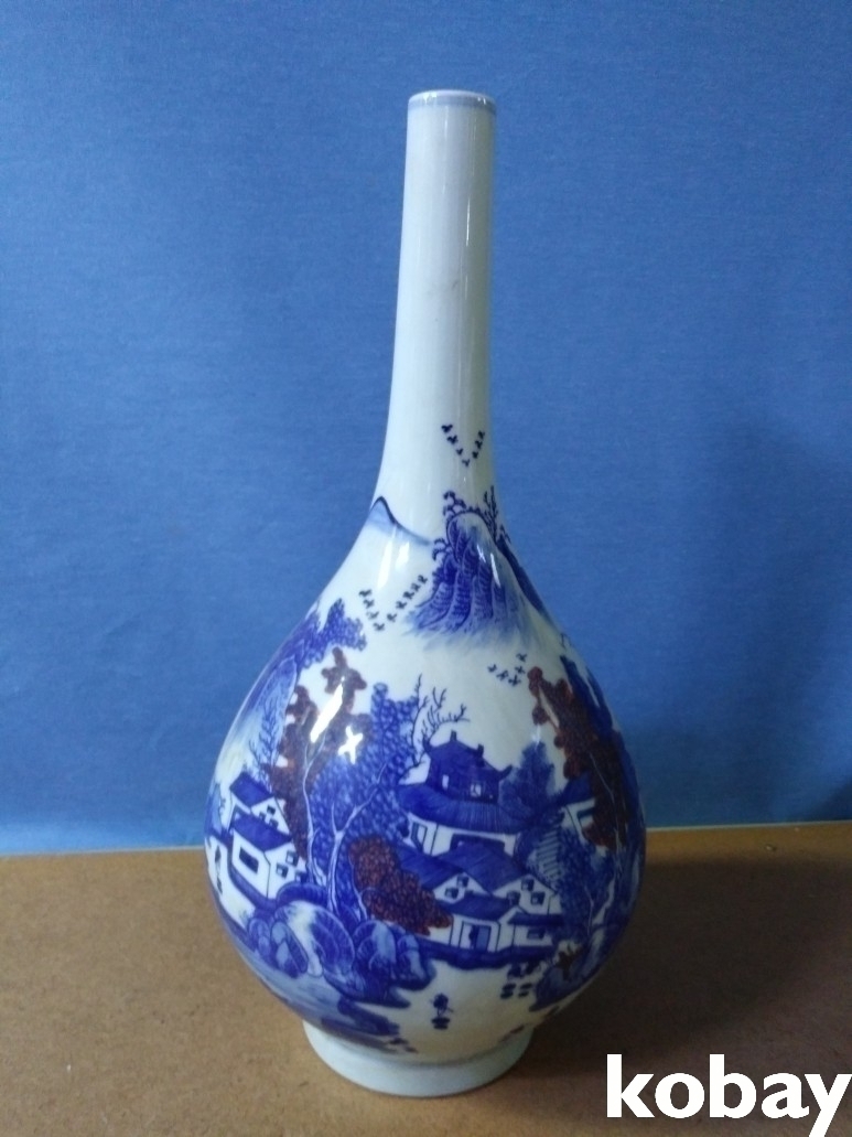산수 풍경을 아름답게 표현한 목긴 주병 도자기 입니다.