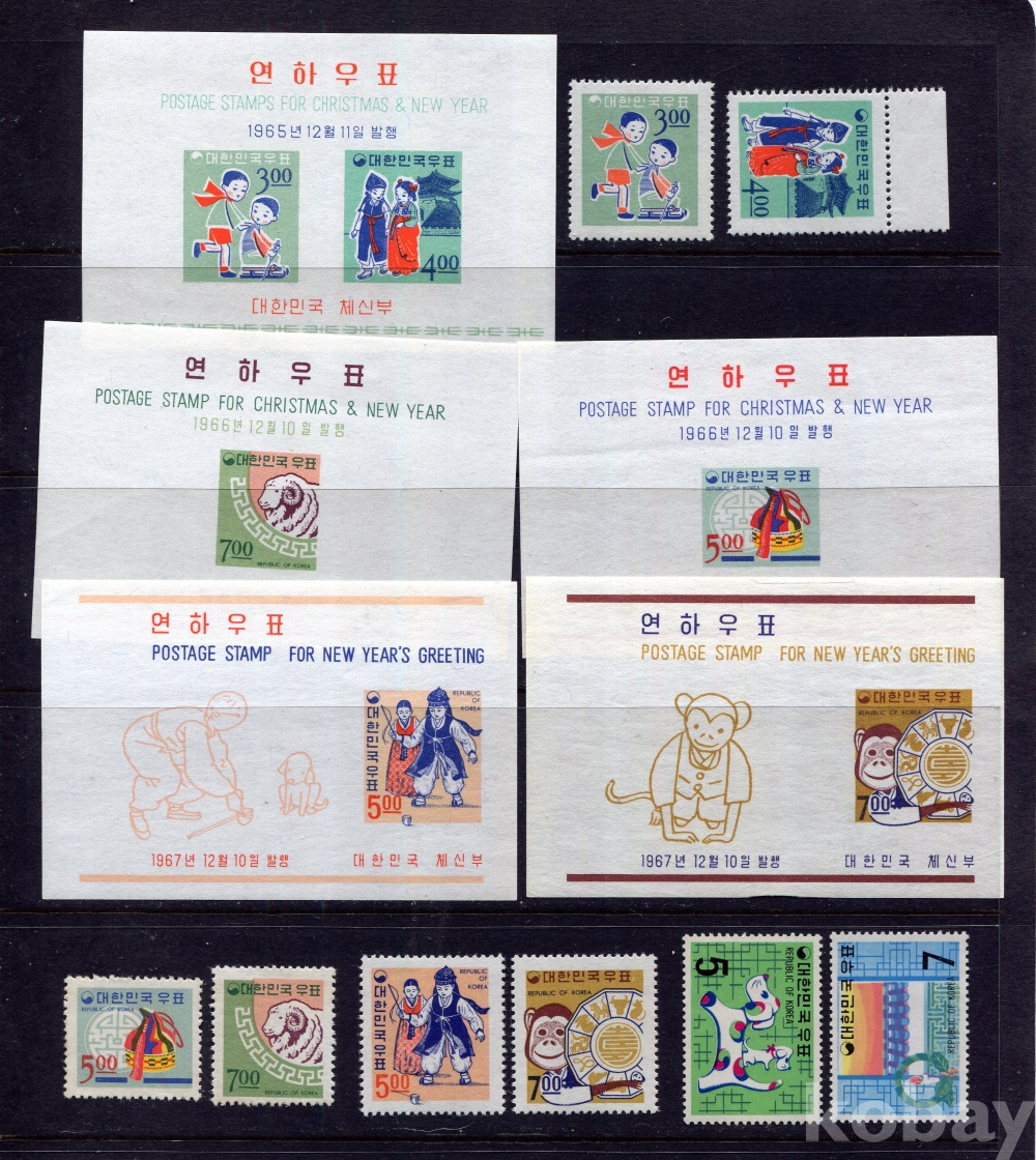 - [시트/우표] 1965-69년 미사용 연하시트 및 우표 모음 (All MNH : Mint Not Hinged : 뒷면 힌지자국없이 깨끗한 상태)