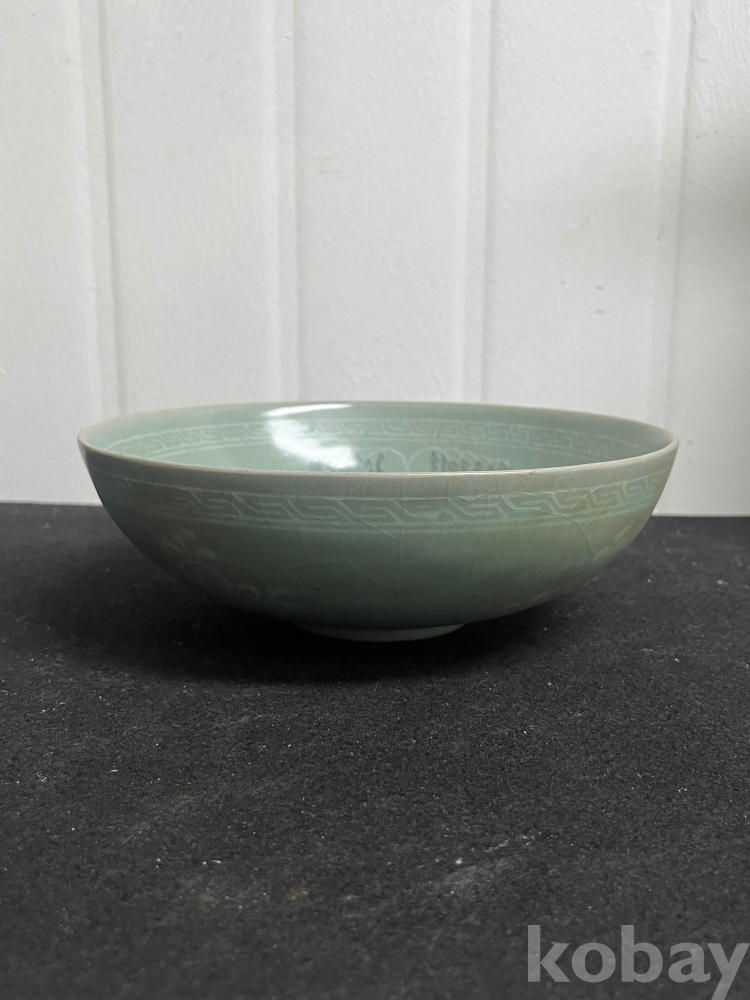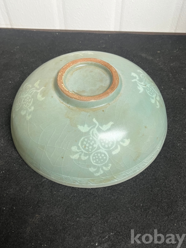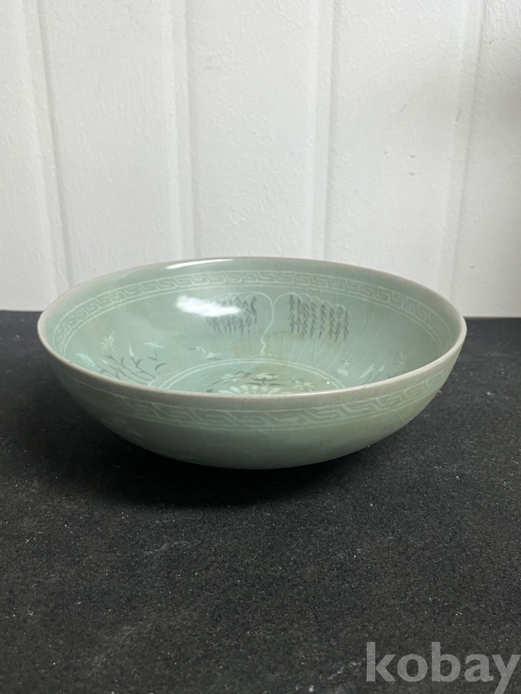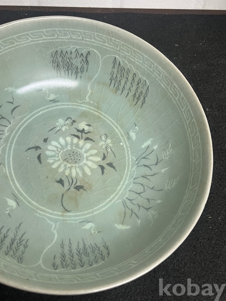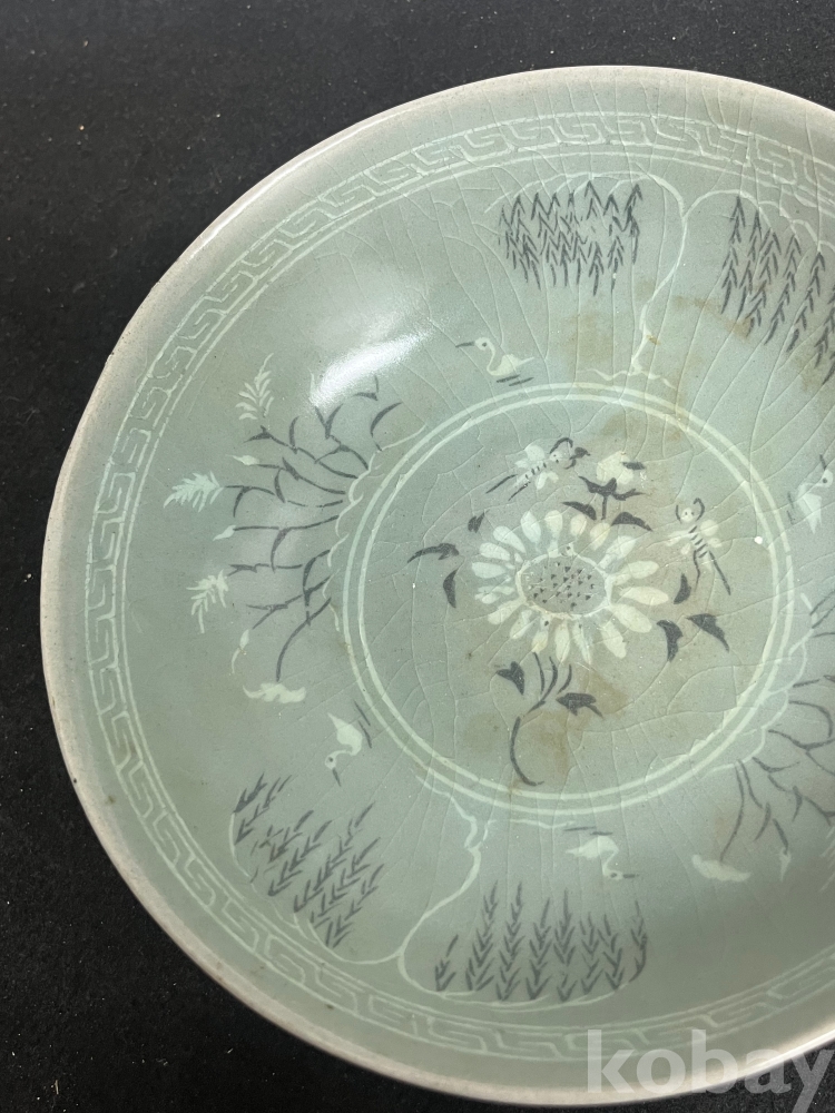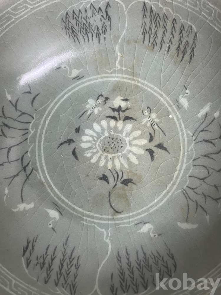 맑은 비취색 유약 위에 흑백 상감 기법으로 국화와 양류학문을 섬세하게 표현하였습니다.